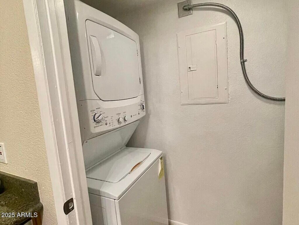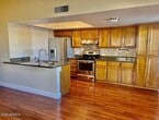 Welcome to this charming and immaculate single-level home featuring 2 bedrooms and 1 full bathroom with elegant dual sinks. Enjoy modern upgrades throughout,including granite countertops in both the kitchen and bathroom,wood flooring in all living areas,and tile flooring in the bathroom. The kitchen is fully equipped with stainless steel appliances,and the home comes complete with an in-unit washer and dryer for your convenience. Vaulted ceilings and white wood window shutters create a bright,open,and stylish living space. Enjoy two private patios,two community pools,and two assigned parking spaces (1 covered/1 uncovered) plus abundant guest parking. Quiet,peaceful community with convenient access to Loop 101,I-17,SR-51,and minutes from Desert Ridge.