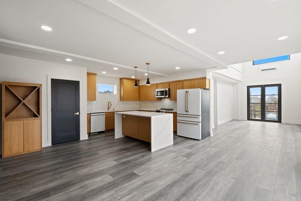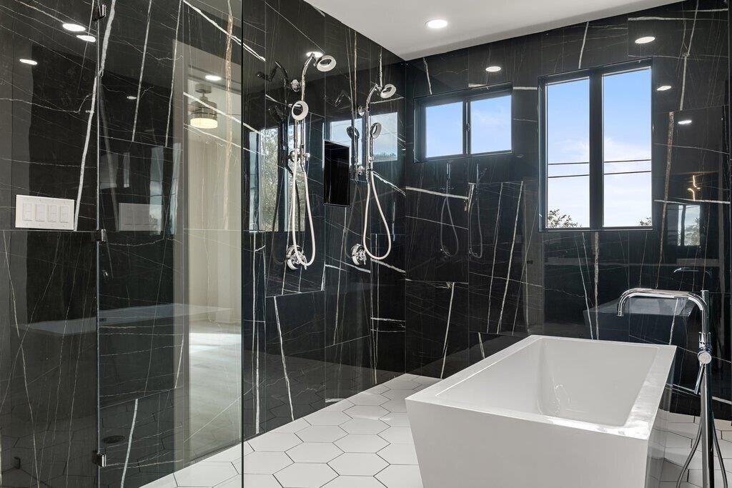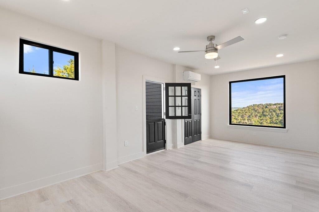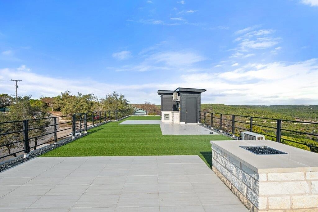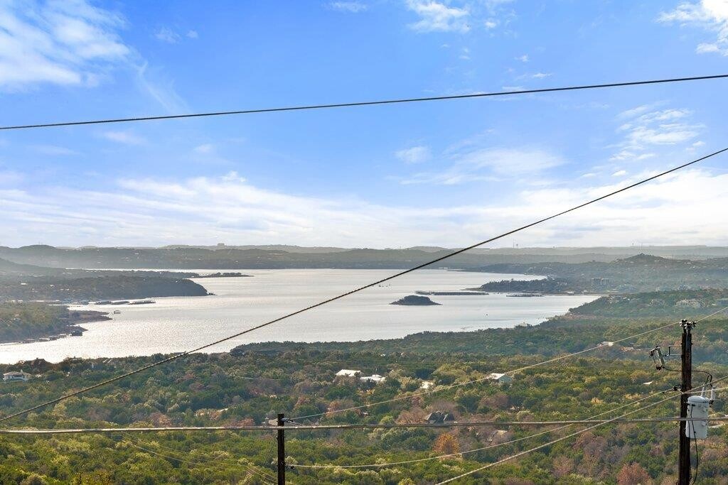 Experience modern luxury with breathtaking Lake Travis and Hill Country views in this brand-new, never-lived-in architectural masterpiece. Offering 3 bedrooms, 3 full baths (including a ground-floor bedroom), this 2,633 sq ft residence features a unique blend of industrial container and concrete construction, delivering striking design and durability. The open-concept floor plan is elevated by soaring ceilings, floor-to-ceiling windows, and an abundance of natural light. The chef’s kitchen is a true showpiece, featuring brand-new GE Café designer appliances, a dramatic waterfall quartz island, 100% rift white oak modern cabinetry, generous storage, and a large walk-in pantry—perfect for both everyday living and entertaining. Indoor living seamlessly extends outdoors with expansive outdoor spaces, including three second-floor balconies and an incredible finished rooftop deck spanning over 1,700 sq ft. The rooftop retreat boasts a fire pit, outdoor kitchen space, and spectacular panoramic views—an entertainer’s dream. Inside, enjoy abundant storage throughout, including a dedicated wine display/storage area, along with high-end wall treatments, designer lighting, and curated décor. All bedrooms are generously sized with finished closets, while the primary suite impresses with stunning views, an oversized closet, a luxury spa-like bathroom with soaking tub and expansive shower, and a large office or flex space. A second-floor living room adds versatility, and the two-car garage completes this exceptional offering. This is modern, custom, luxury living at its finest—designed for those who appreciate bold architecture, refined finishes, and unforgettable views.