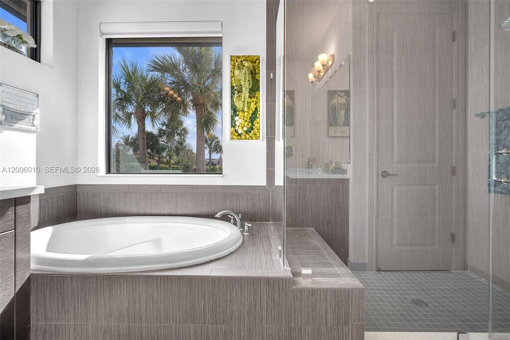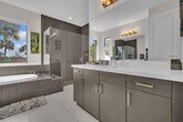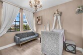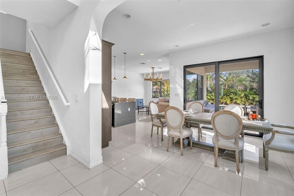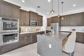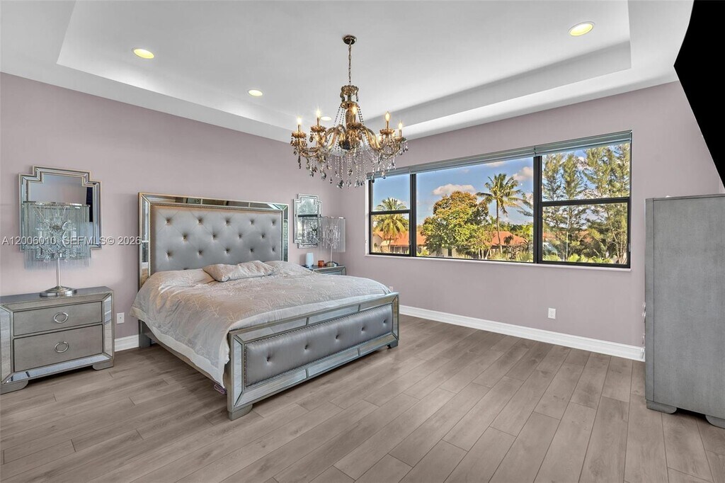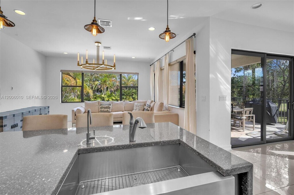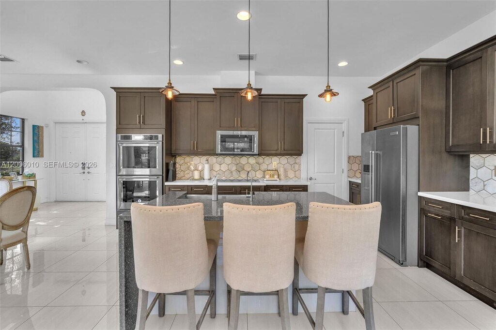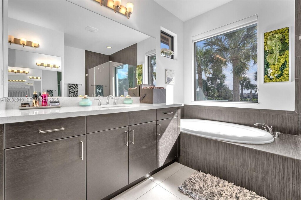 Enter this beautiful home through a short, well-manicured pathway. Double doors lead to open concept great room + electric shades with wonderful view of canal & pool. Kitchen boasts dark cabinets with contrasting quartz countertops + large center isle loaded with extra storage. Elegant SS appliances & custom pantry complete your kitchen. Downstairs has 24x24 tiles, an 11' ceiling with chandelier & bedroom with full bath. Stairs & upper floor completed with luxury wood vinyl. Primary with stunning finishes including customized closets, glass enclosed shower & dual basins. Second floor has two additional bedrooms w/custom closets, chandeliers & laundry with cupboards & linen closet + large mezzanine. Newer very well-maintained community with gym. Near to I75, shops, restaurants & services. MLS # A12006010