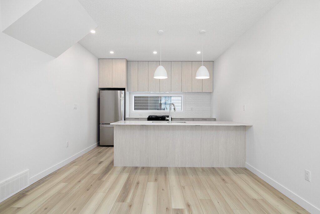 Make this upscale 3-bedroom suite your new home today! This main floor 1100 sq ft, 3 bed, 2.5 bath townhome offers: -Spacious 9' ceilings -Floor to ceiling windows in living and dining areas -Ample natural night -Open concept layout from kitchen to dining and living area -Luxury vinyl wide plank and carpeted flooring - Stainless steel appliances with natural gas stove -Quartz countertops with custom cabinetry -Designer breakfast bar -Dual Master Suites -High efficiency, triple pane windows -LED lighting package throughout Unit amenities: Carpet, Cat friendly, Dishwasher, Dog friendly, Dryer, Garage parking, Kitchen island, Microwave, Pet friendly, Refrigerator, Stove and oven, Walk-in closets, Washer, Window coverings This is a main floor suite, there is a basement suite below. Utilities are $275 per month as an estimated amount. Parking Garage is $100 per month.