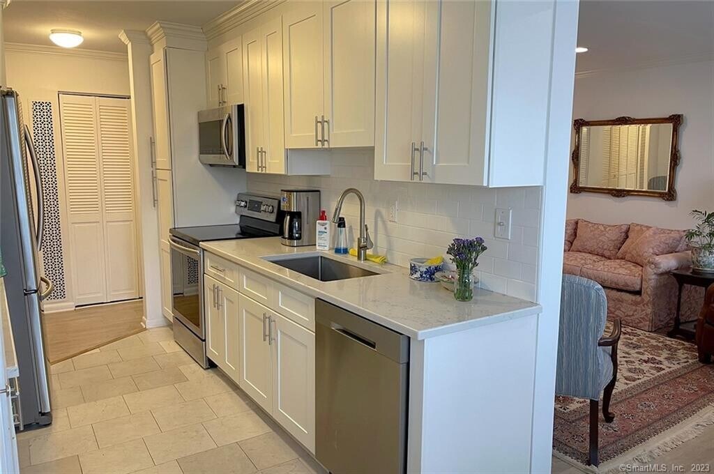 Call for Availability - This sun-filled and spacious first-floor residence offers two bedrooms and two full bathrooms. The updated kitchen opens to a private, inviting patio with tranquil views of mature trees and landscaped gardens. The primary suite features an en-suite bath and a walk-in closet. Additional highlights include an in-unit washer and dryer and a one-car garage. Set within the desirable Southport Woods community, residents enjoy exceptional amenities such as a heated in-ground pool, clubhouse, paddle tennis courts, and on-site property management. Ideally located near trains, major highways, beaches, and shopping, with a short stroll to the charming historic Southport Harbor and Village. MLS# 24152117