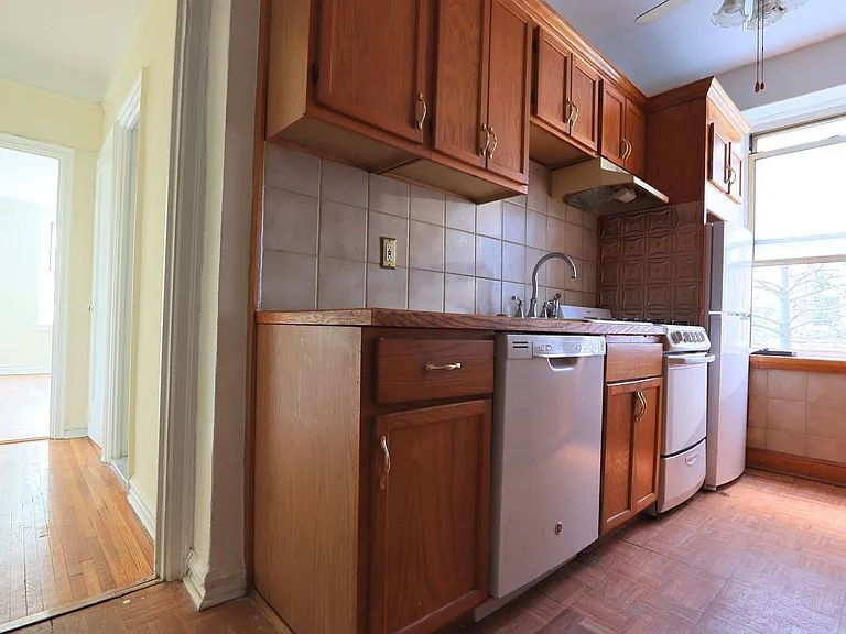 Located in a well-maintained co-op building along scenic Shore Road, this generously sized one-bedroom apartment offers classic pre-war charm and exceptional access to all that Bay Ridge has to offer. Situated just outside the park and steps from express buses, it combines convenience with the tranquility of a picturesque neighborhood. Upon entry, you're welcomed by a large foyer featuring pre-war details such as graceful archways, two oversized closets, and unique window-style openings that create an open, inviting atmosphere. The expansive living room easily accommodates a full furniture set, making it ideal for both relaxing and entertaining. The traditional kitchen features vintage tin paneling, a farmhouse sink, dishwasher, stove, and refrigeratoroffering a blend of function and old-world character. The bathroom includes timeless white subway tile and is outfitted with both a bathtub and a separate shower. The king-size bedroom is a standout, showcasing double exposure for excellent natural light, along with a spacious closet for ample storage.