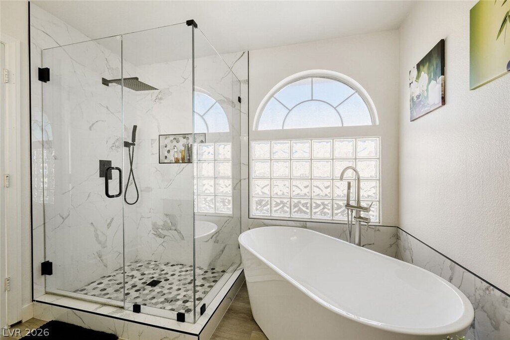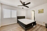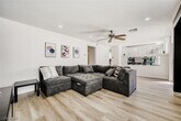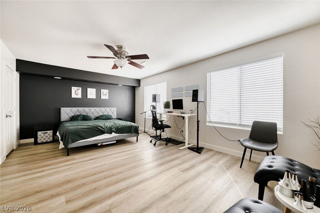 Located in Las Vegas, this FULLY FURNISHED 4-bedroom, 3-bath home combines modern finishes with practical design. Luxury vinyl plank flooring flows throughout, complemented by upgraded lighting fixtures and ceiling fans. The kitchen features recessed lighting, custom cabinets, and a breakfast bar/kitchen island for casual dining and meal prep. The generous primary suite includes a walk-in closet and a primary bath with dual sinks, separate tub and shower. Beautifully landscaped backyard offers artificial turf, a paved patio with an awning and patio fan—ideal for outdoor living year-round. As an extra added perk, Trash, Sewer and Tenant Portal Fee are included in rent! *Owner Occupied-Owner can move out once tenant is approved*