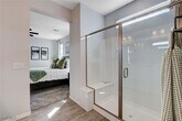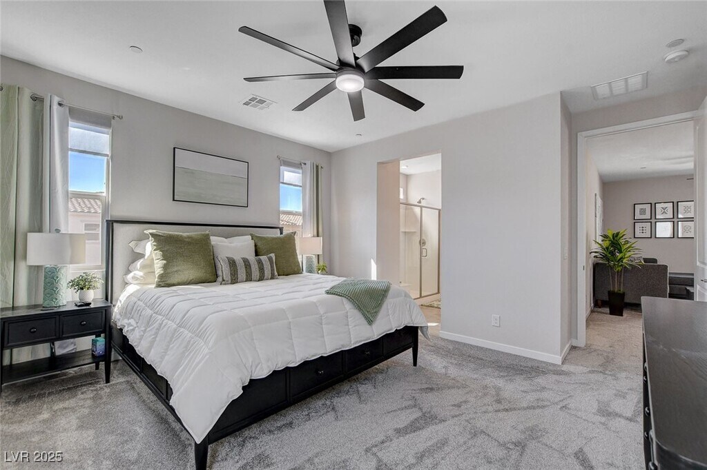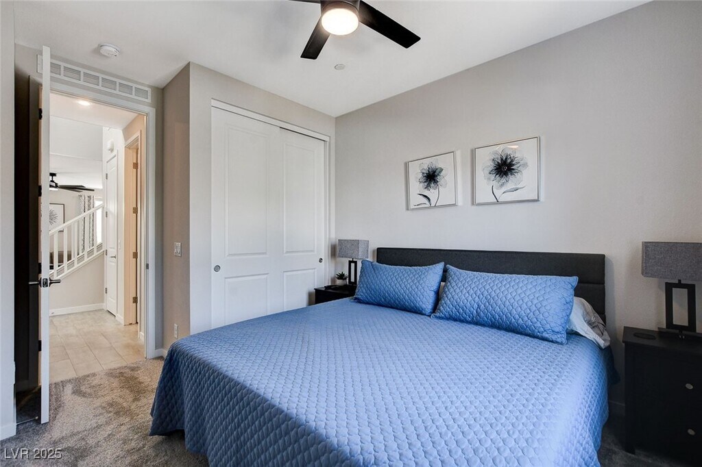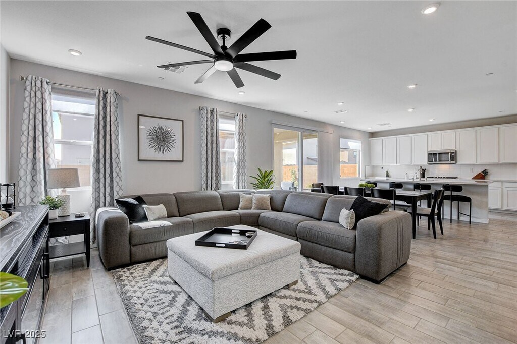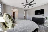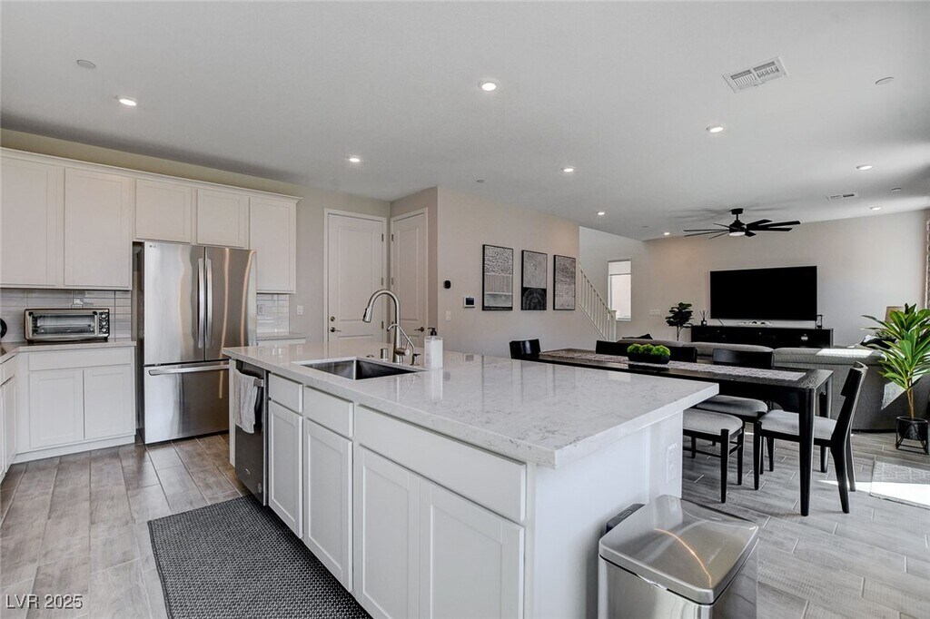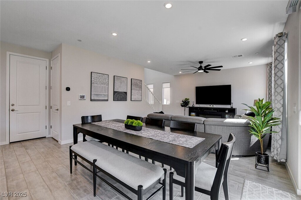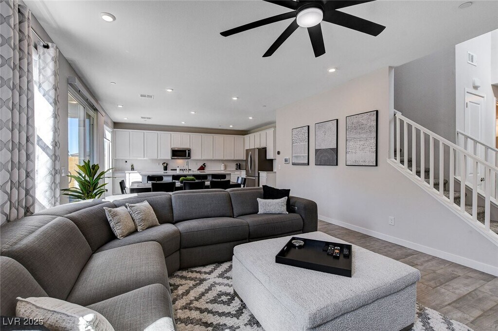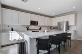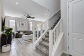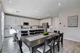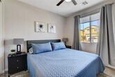 This modern home offers 2119 square feet of a refined open-concept design with spacious living areas. The elegant great room flows into a stylish gourmet kitchen featuring quartz countertops, stainless steel appliances, a tile backsplash, a breakfast nook, 42' shaker cabinets and a open dining area. A downstairs bedroom with a ¾ bath adds flexibility for guests. Upstairs includes two secondary bedrooms—one with a large walk-in closet—a convenient laundry room, and a contemporary hall bath. The private primary suite features an oversized walk-in closet and a spa-inspired bath with dual sinks, a walk-in shower, and a makeup vanity. The professionally designed backyard offers pavers, turf, citrus trees, and lush plants for a serene outdoor retreat. Additional upgrades include a large covered patio, 9' ceilings, 8' interior doors, custom window coverings, upgraded designer ceiling fans, and a new whole-home water filtration system. .