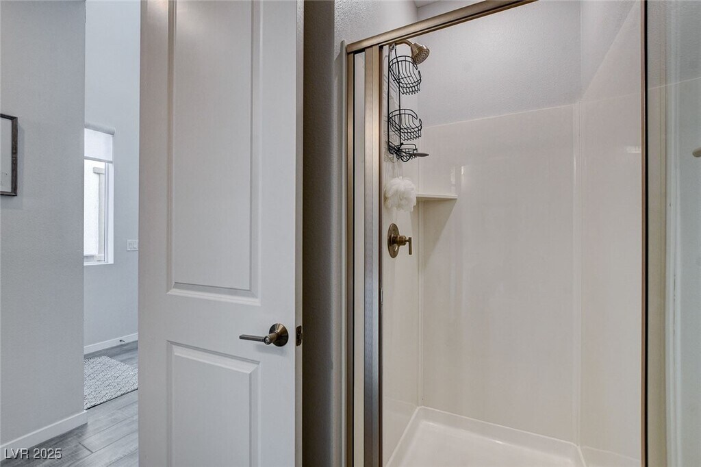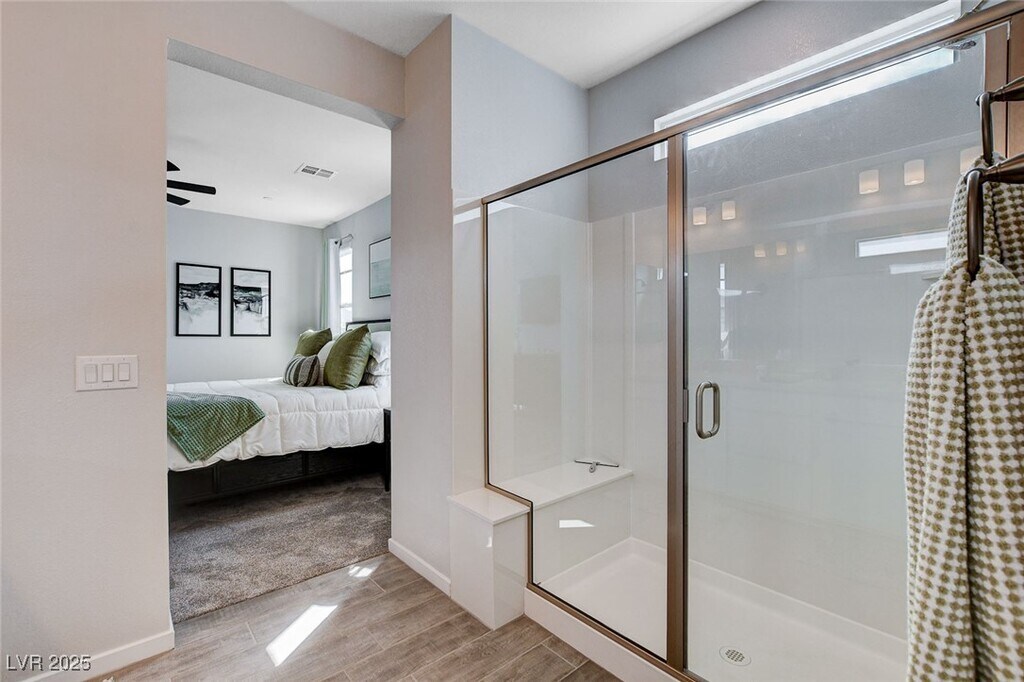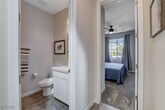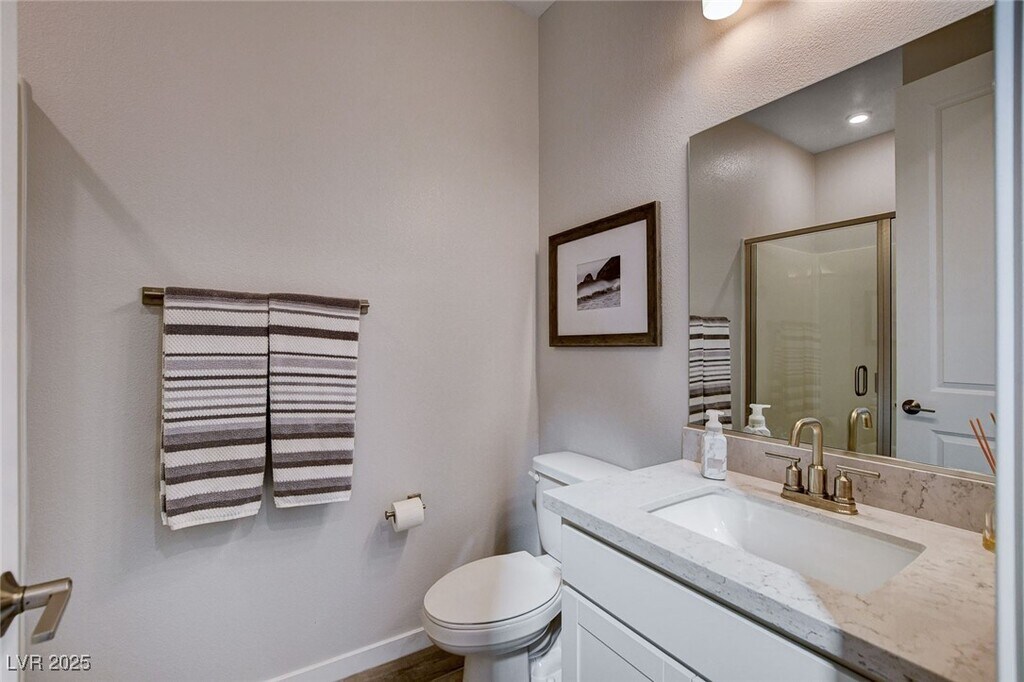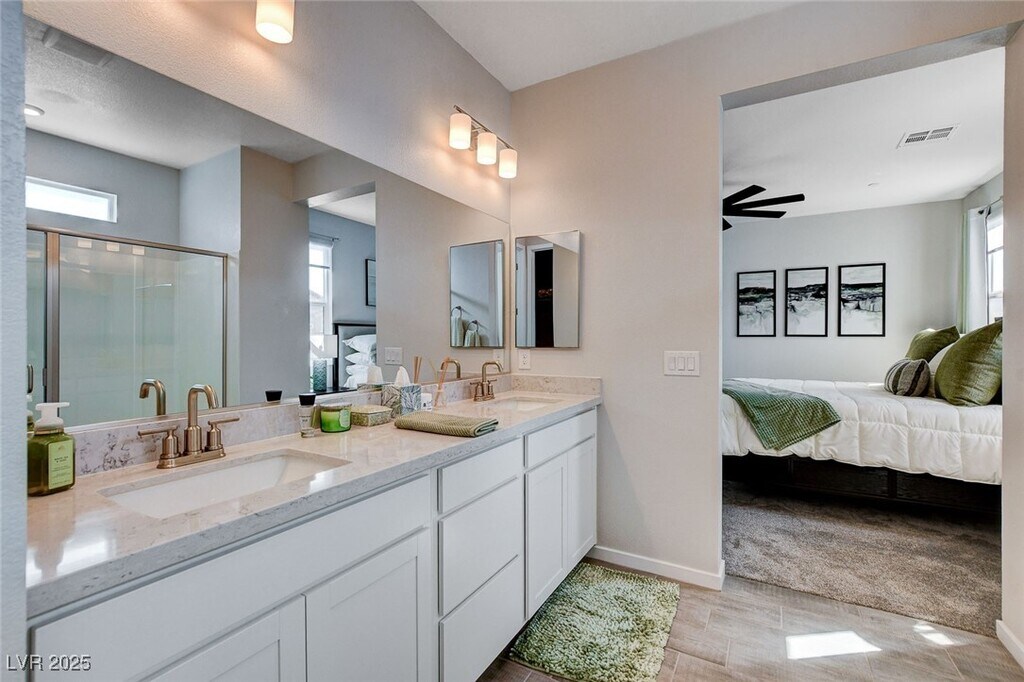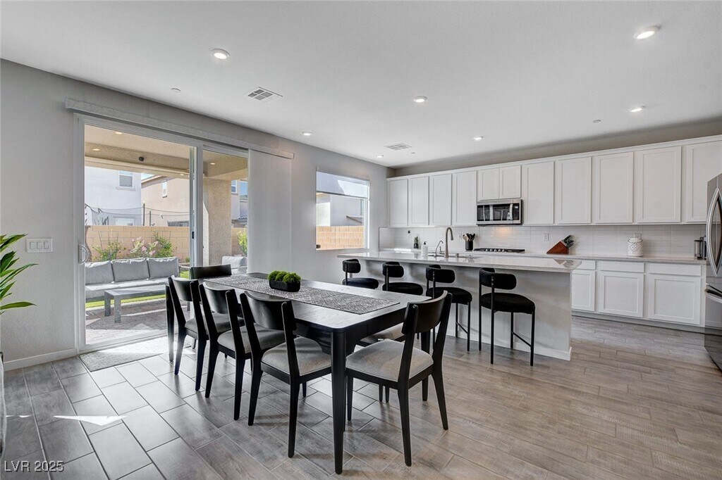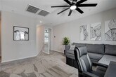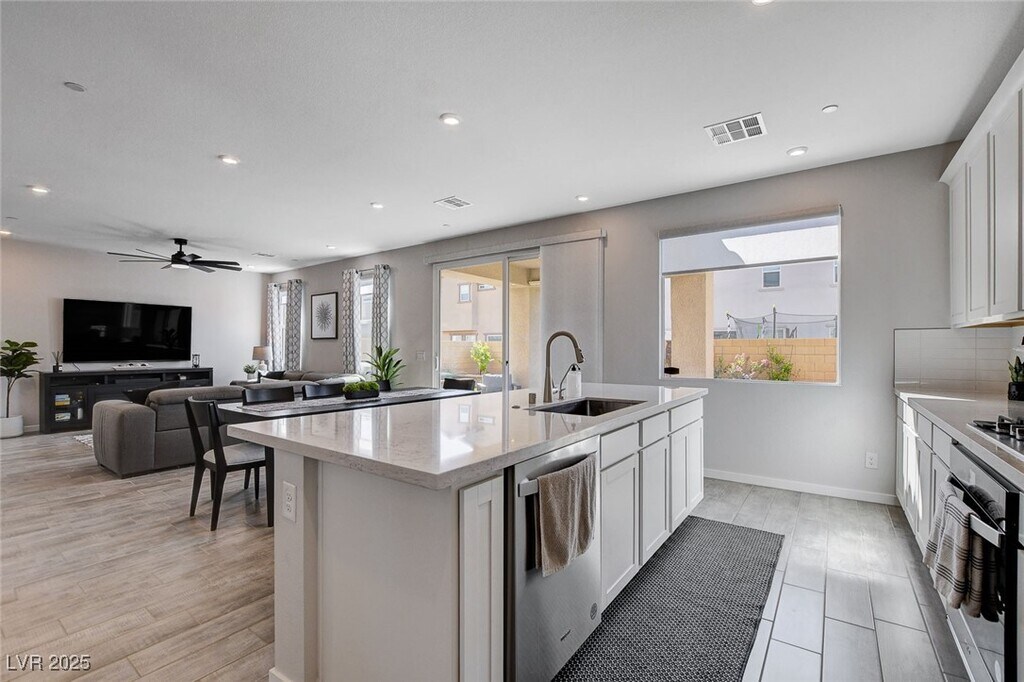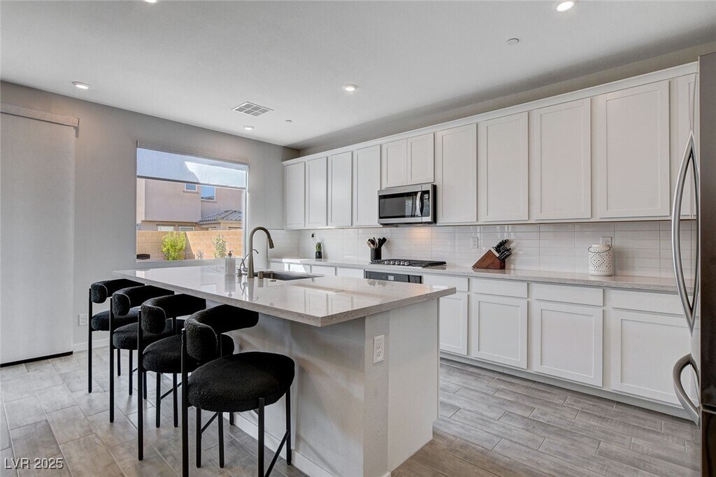 This modern home offers 2119 square feet of a refined open-concept design with spacious living areas. The elegant great room flows into a stylish gourmet kitchen featuring quartz countertops, stainless steel appliances, a tile backsplash, a breakfast nook, 42' shaker cabinets and a open dining area. A downstairs bedroom with a ¾ bath adds flexibility for guests. Upstairs includes two secondary bedrooms—one with a large walk-in closet—a convenient laundry room, and a contemporary hall bath. The private primary suite features an oversized walk-in closet and a spa-inspired bath with dual sinks, a walk-in shower, and a makeup vanity. The professionally designed backyard offers pavers, turf, citrus trees, and lush plants for a serene outdoor retreat. Additional upgrades include a large covered patio, 9' ceilings, 8' interior doors, custom window coverings, upgraded designer ceiling fans, and a new whole-home water filtration system. .
