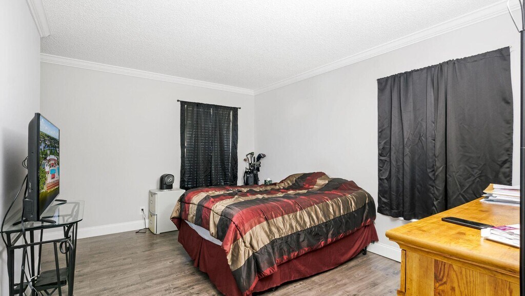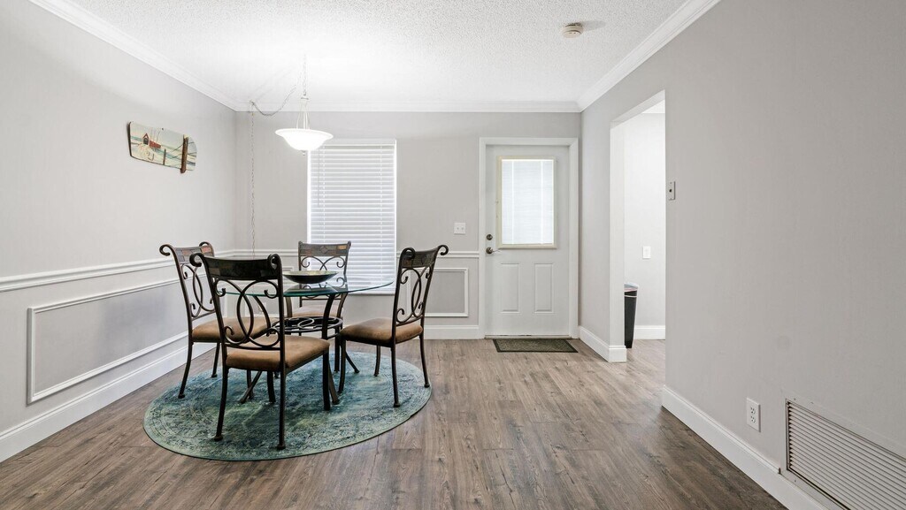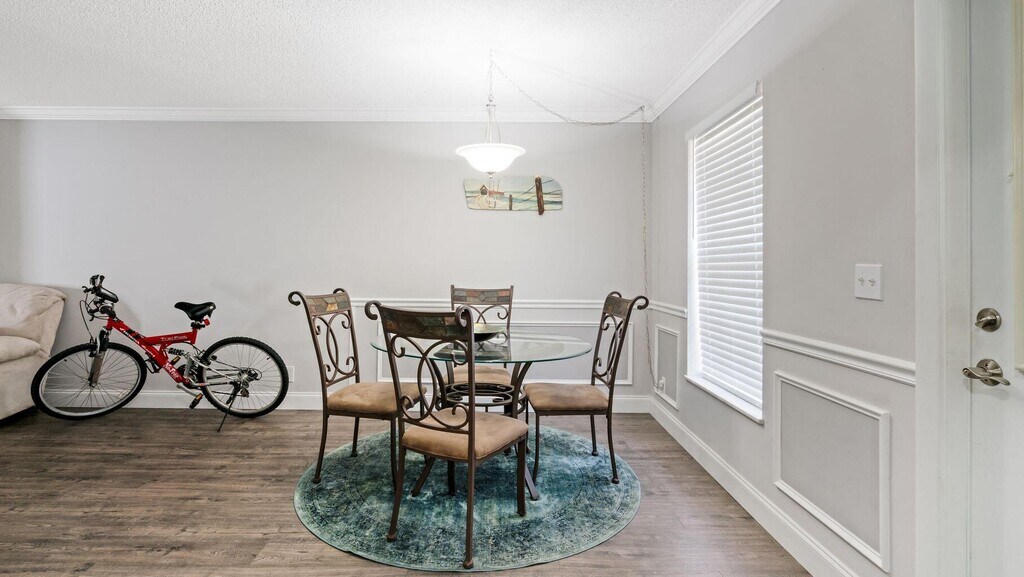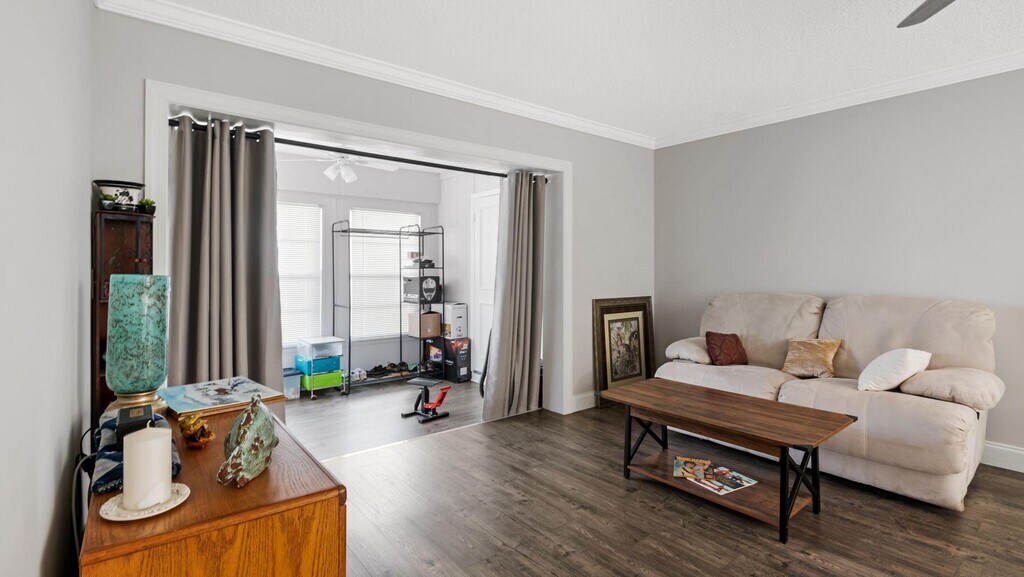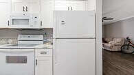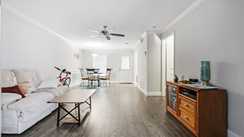 This fully remodeled villa presents a stunning kitchen and bathroom featuring premium wood cabinets, granite countertops, and upgraded white appliances. Elegant vinyl plank flooring runs throughout, accented by fresh baseboards, knock-down ceilings, and tasteful crown molding. Enhancements include a new hot water heater, upgraded bathroom vanity, shower, and toilet, along with a modern electrical panel, plumbing, exterior door, and ceiling fans. The enclosed porch has been opened to expand living space, and interiors showcase fresh paint and designer finishes throughout.