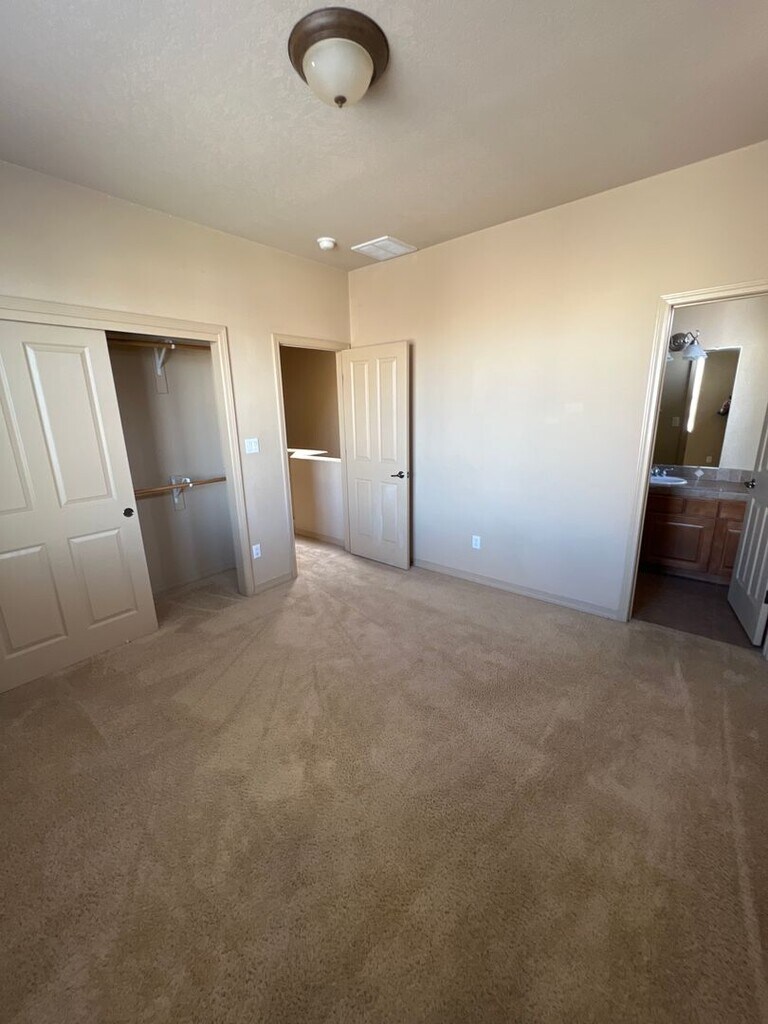 Incredible location in the gated Desert Ridge Community in Albuquerque Acres, less than 10 years old. Modern Pueblo design, two story 1500/sf open living room with T&G Beam ceiling, gas fireplace, kitchen with Corian countertops, breakfast bar, and loads of cabinets, laundry room, two primary bedrooms, the larger with garden tub and beautiful separate shower, downstairs guest bath and single car garage. Upstairs has covered deck with views and rear yard just the right size for grilling and chilling. Tenant pays all utilities and renters insurance. No Smoking, No Pets Please. To schedule a showing and for rental application go to