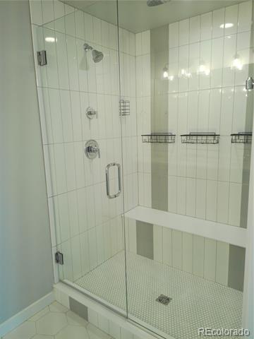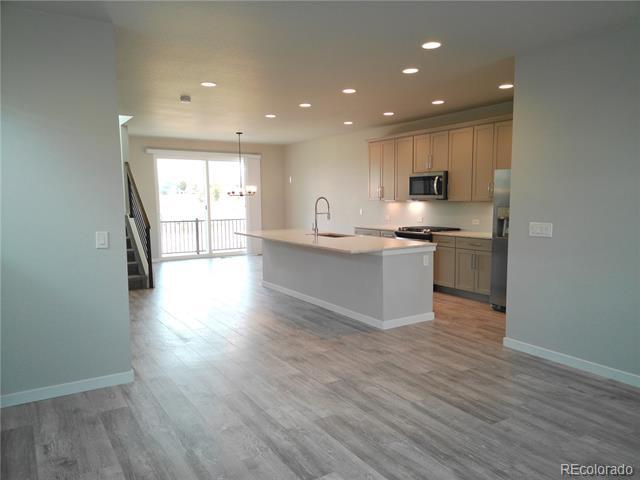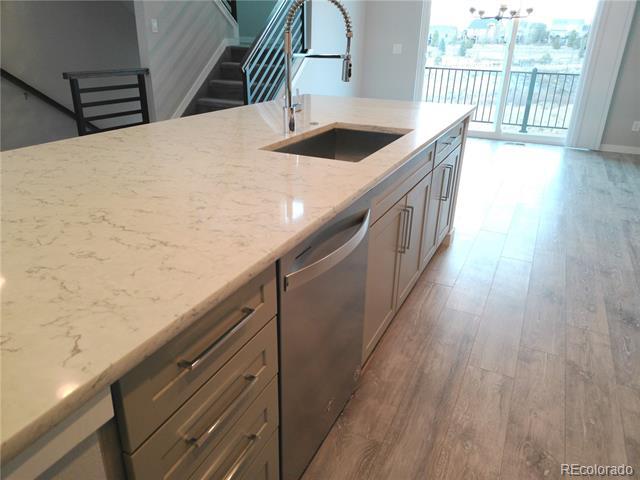 This contemporary home offers comfort and style with 3 bedrooms, each featuring a private bath. A covered porch with a mountain view greets visitors. The main level has an open-concept design and high ceilings. The kitchen includes stainless appliances and a large solid surface countertop, plus a spacious pantry and storage closet. The dining area leads to a balcony with a view of the mountain range and Pikes Peak. The living room has ample space, and a guest bath completes the main floor. The upper level has a large primary bedroom with a spa-like bathroom, double vanity, linen closet, and a walk-in closet with shelving. A secondary upper-level bedroom also includes a private bath. The flex-space loft on this level is ideal for play, work, or movie night. The lower level offers another bedroom and a luxury bath. This home is beautifully situated in the community, with mountain views, nearby guest parking, and steps from the mailbox station. Central AC and a 2-car attached garage are included. Single Family Residence MLS# 7188429