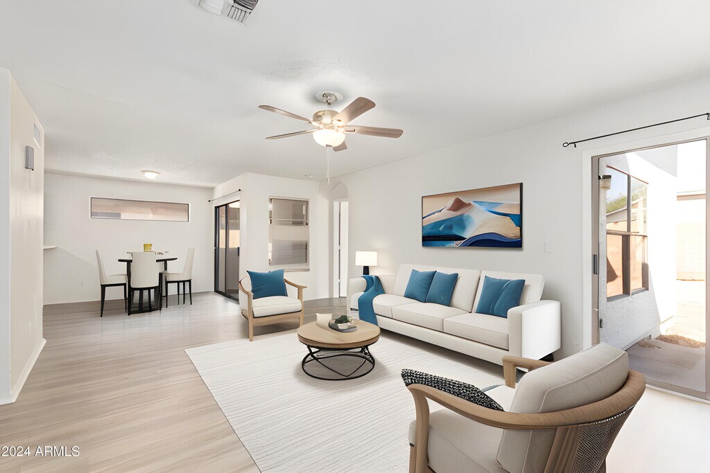 Discover the epitome of tranquil living in this single-story residence nestled in the coveted Ryan's Ridge community. With its peaceful ambiance,this 3-bedroom retreat offers a spacious floor plan adorned with updated flooring,creating a seamless blend of comfort and style. Embrace the heart of the home in the generously proportioned,open kitchen boasting an abundance of cabinet space,perfect for storing your culinary essentials. Gather around the inviting breakfast bar for cozy morning conversations or casual meals with loved ones. Unwind in the well-appointed master bedroom,featuring ample space and a convenient walk-in closet. Retreat to your private backyard,complete with a covered patio and low maintenance landscaping. Excellent location just moments away from the 101 freeway,Westgate Entertainment District,the iconic Cardinals stadium,and a plethora of shopping and dining destinations.