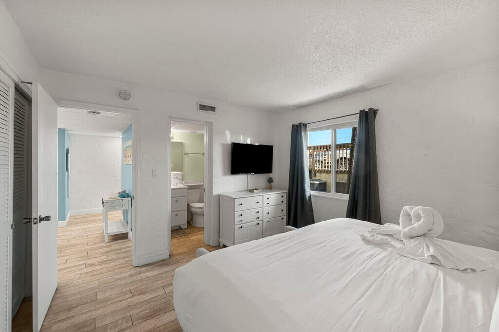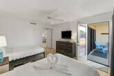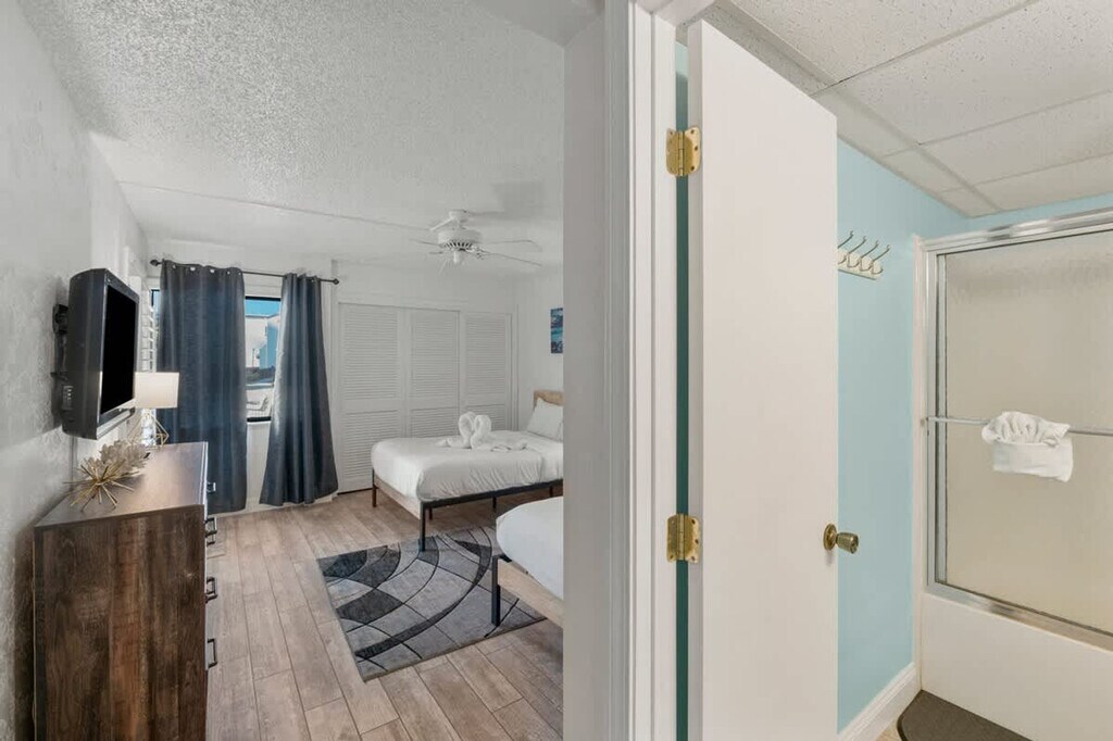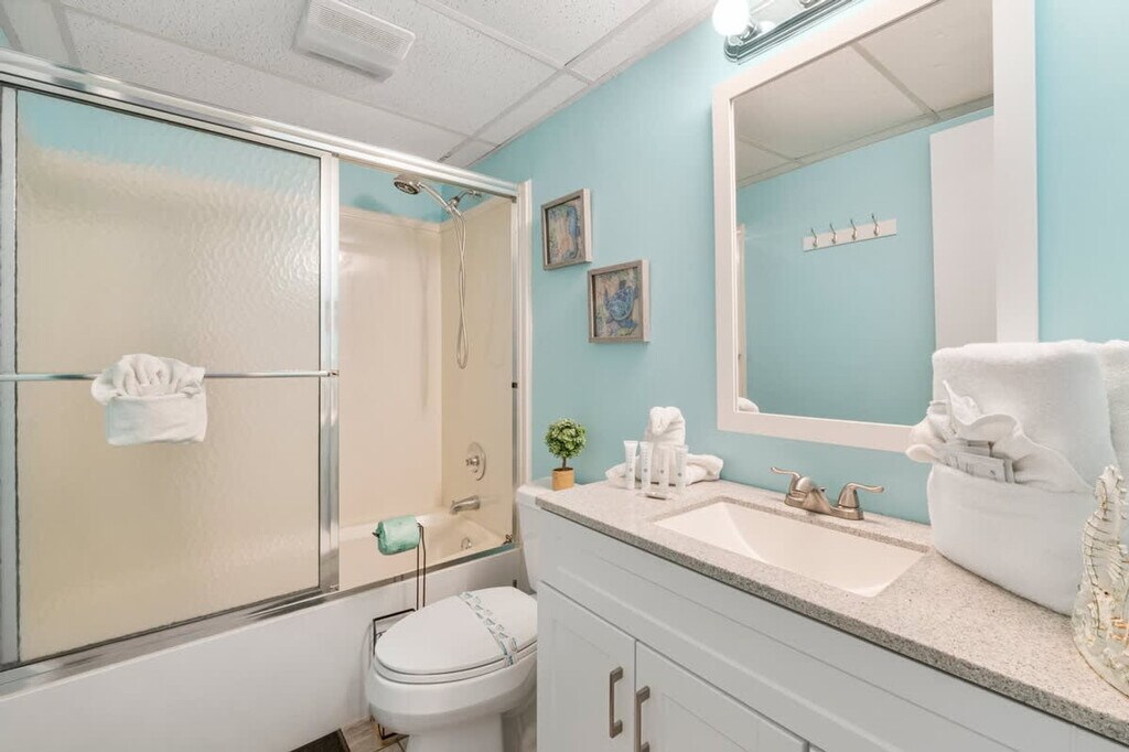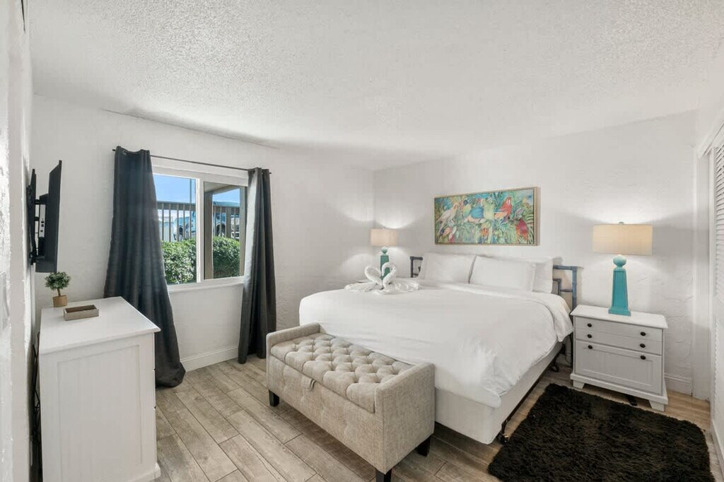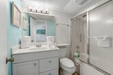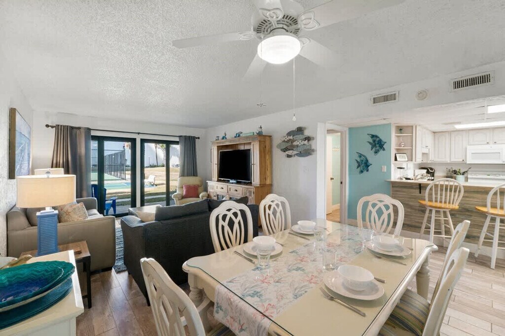 Feel at home in this charming ground-level, 2-bedroom, 2-bath beachside condo, offering a perfect blend of coastal comfort and convenience. You'll find an open and airy living space tastefully adorned with beach-inspired decor. The fully equipped kitchen features all appliances and ample counter space. The dining and living area provides a welcoming spot to share meals and laughter. The master bedroom boasts a comfortable king-size bed, creating a serene haven for relaxation. The second bedroom is furnished with two double beds, ensuring everyone has a comfortable resting place. With two full baths and a washer and dryer, you will surely have everything needed to prepare for your night out. Enjoy amenities, which include a pool, tennis and shuffleboard court, and a short walk to the sand. The resort fee is $35 and includes one parking pass; the rate may change without notice. Registration must be done online. One car pass is $35, and two car passes are $50 plus booking and processing fees; price is subject to change without prior notice per HOA regulations. You are not allowed to park more than two vehicles at the property. Trailers cost $100 per space; if a trailer takes up two spaces, it would cost $200. The office must approve all trailers before arrival. Located on the beach side, this apartment is four miles from St. Andrews State Park, one mile from Wal-Mart Super Center, within walking distance to restaurants and an amusement park, and half a mile from Signal Hill Golf Course. Check-in is at 4 PM CT, or 5 PM during Spring Break and major holidays. This resort requires the registered guest to be 25 years old. Per PCB Ordinance 1632, the maximum occupancy is eight guests, including children and infants; failure to abide by the ordinance may result in fines and ejection. Quiet hours are between 10 PM and 7 AM. No pets are allowed. [SI]