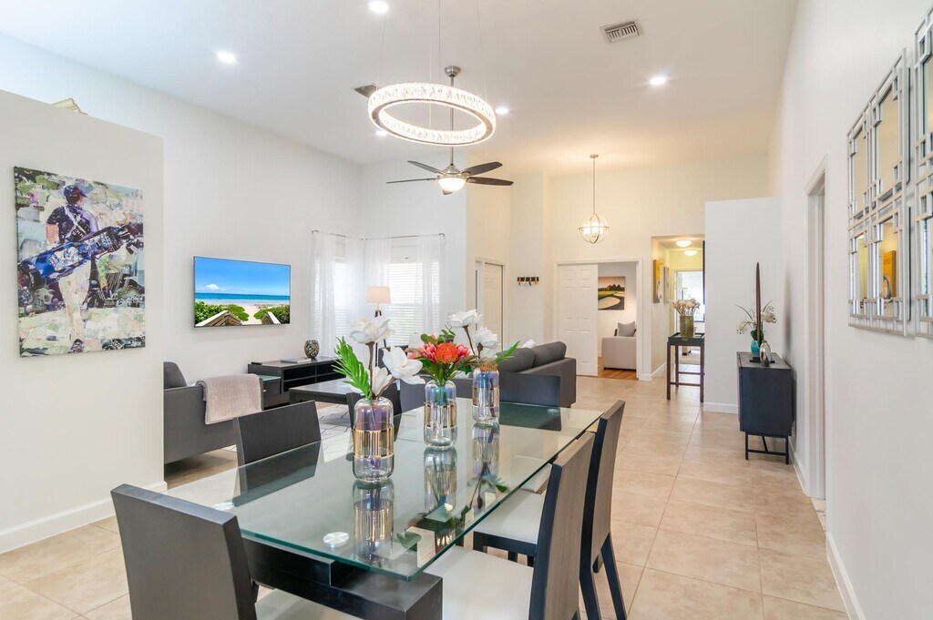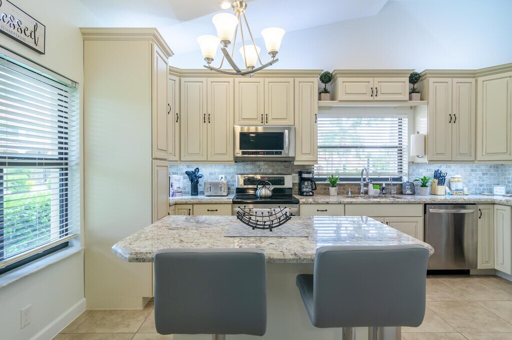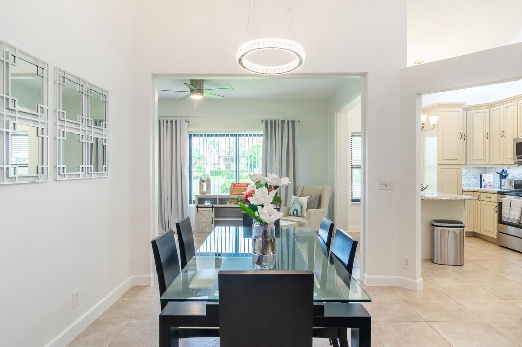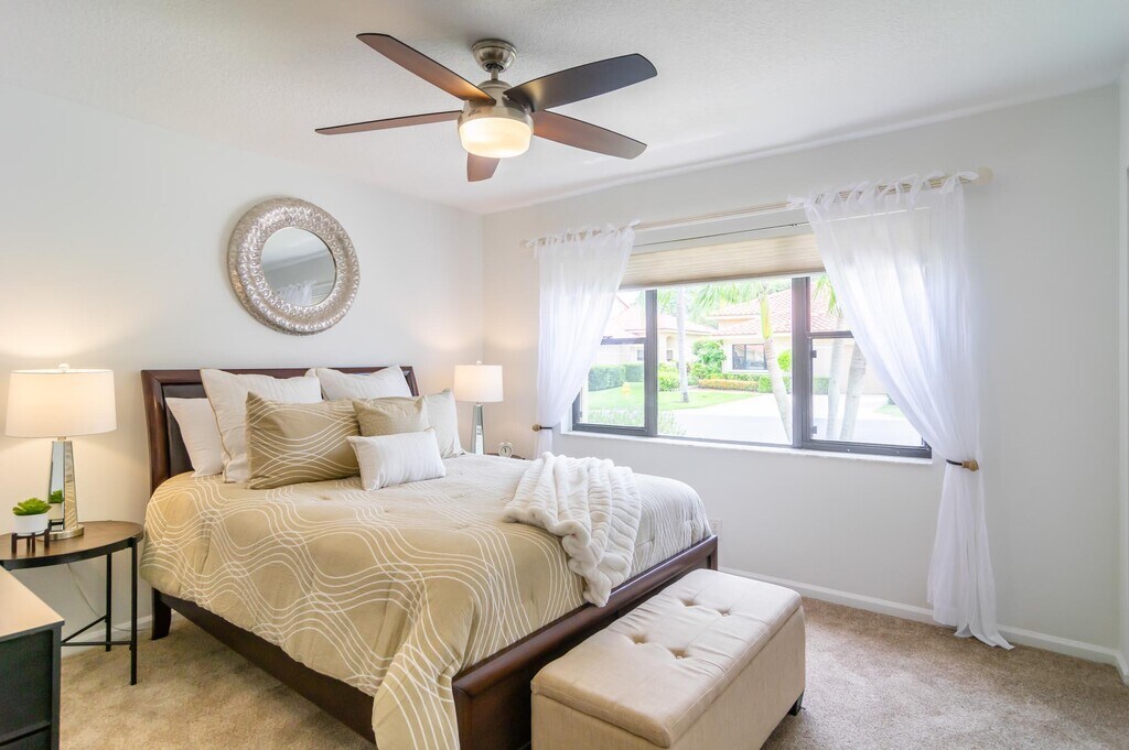 Available for Furnished annual, $3850, or $7,000/mo seasonally, Furnished only. Remodeled 3BR/2BA end-unit townhome in the sought-after community of Windermere at PGA National. This open floor plan offers volume ceilings, a bright living space with tons of windows letting in tons natural light, and a completely remodeled kitchen with beautiful neutral wooden cabinetry, granite countertops, and stainless-steel appliances. The second bedroom is located just off the living room and makes a perfect office, and the primary bedroom is spacious with a sliding glass door to the fantastic, enclosed patio offers tons of space for entertaining. New carpet in the primary bedroom/3rd bedroom, high-end LVT in the second bedroom/office. Windermere offers a community pool and pavilion for relaxation, an