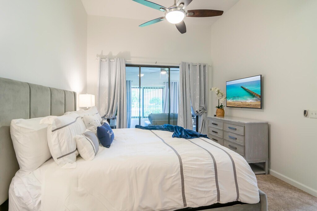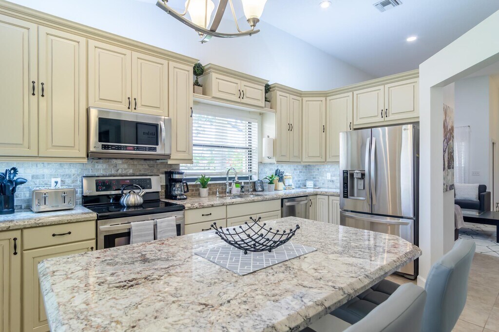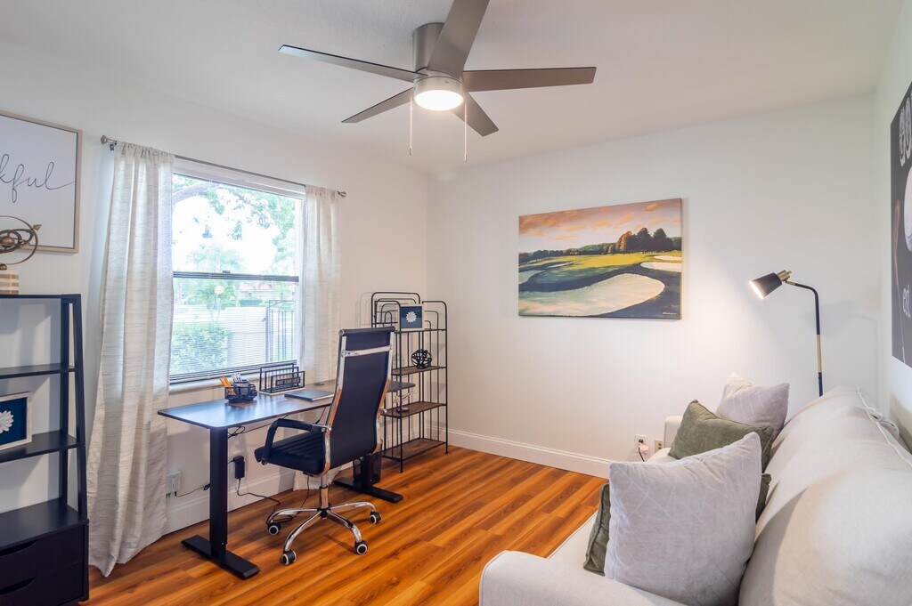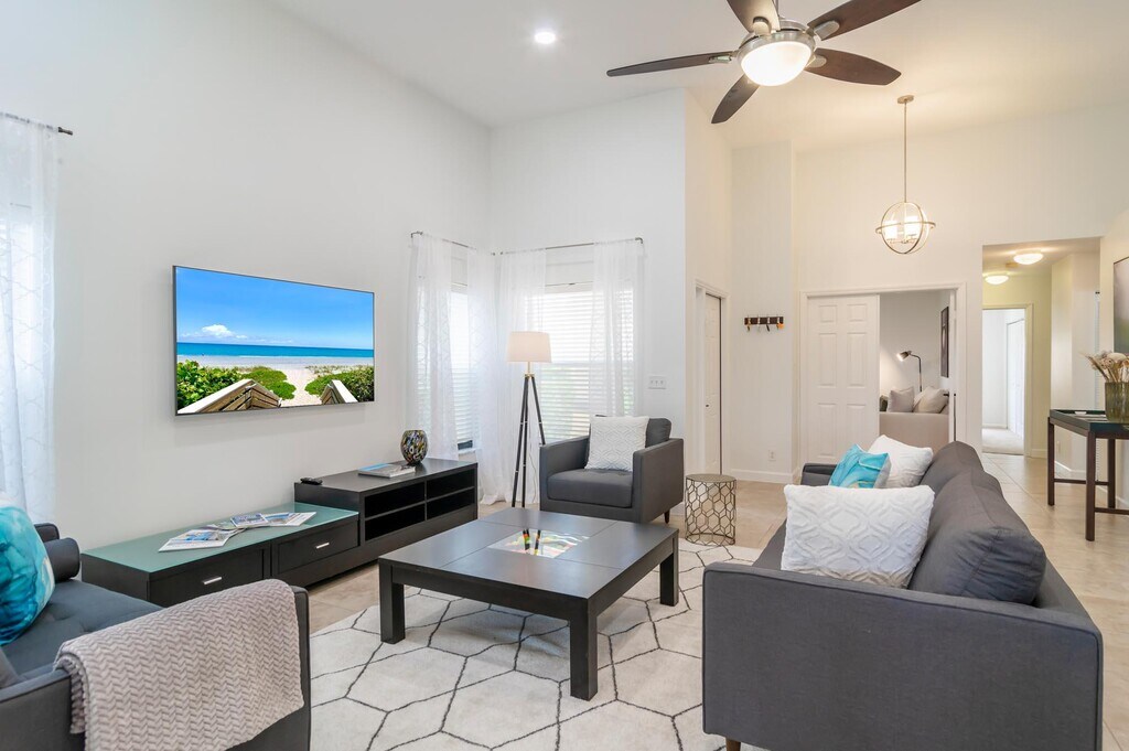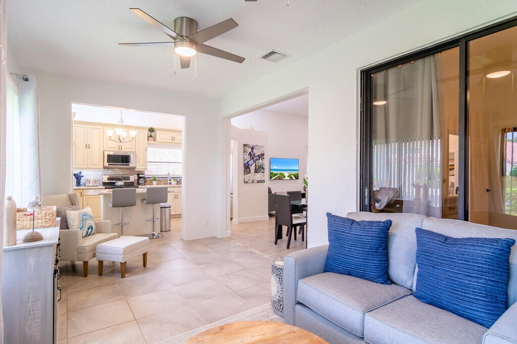 Available for Furnished annual, $3850, or $7,000/mo seasonally, Furnished only. Remodeled 3BR/2BA end-unit townhome in the sought-after community of Windermere at PGA National. This open floor plan offers volume ceilings, a bright living space with tons of windows letting in tons natural light, and a completely remodeled kitchen with beautiful neutral wooden cabinetry, granite countertops, and stainless-steel appliances. The second bedroom is located just off the living room and makes a perfect office, and the primary bedroom is spacious with a sliding glass door to the fantastic, enclosed patio offers tons of space for entertaining. New carpet in the primary bedroom/3rd bedroom, high-end LVT in the second bedroom/office. Windermere offers a community pool and pavilion for relaxation, an