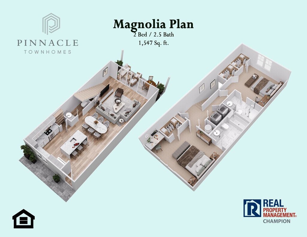 Magnolia Floor Plan Units available from $1,900/mo. to $2,050/mo. with available discounts, promotions and concessions applied. Contact us for details. The Magnolia Plan is a 2 BD/2.5 BA luxury townhome located in the newly constructed community of The Pinnacle Townhomes. The lower level offers an open concept floor plan for the main living areas. The kitchen includes granite counters, ample cabinets, full sized pantry and is anchored by an island with a breakfast bar and pendant lighting. All appliances are stainless steel, and the stove and refrigerator are WiFi connected using the Samsung SmartThings App. Beautiful flooring flows seamlessly from the kitchen through the dining and living areas. A powder room is conveniently located on the main level. Expansive patio doors take full advantage of the natural light and allow access to the covered patio and private courtyard. The upper level features a master bedroom with two walk-in closets and a private full bath with step-in shower. The second bedroom includes a private bath with tub/shower combo. The laundry closet is conveniently located on the upper level near the bedrooms. Additional features of the Magnolia include recessed lights, ceiling fans and 2” window blinds throughout. Pinnacle Townhomes has some of the largest and best appointed rental units in the area. Make sure to schedule a showing with us to see for yourself. Schedule a Showing: Virtual Tour: We are an Equal Housing Opportunity Management Company and abide by the term of the Federal Fair Housing Act. Pets allowed with prior approval and required pet fees.