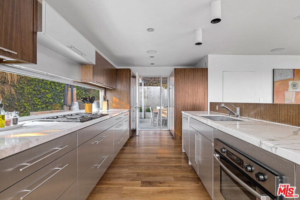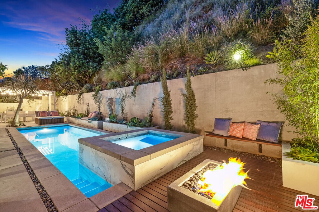 Fire meets water on the hidden-away terrace of this Sunset Plaza retreat. The pool and hot tub are bordered on one side by a firepit, and on the other by a dining area and barbecue. A balcony lines the great room, offering city views, and a window acts as backsplash in the kitchen, peeking at the garden. It's a short drive to shops and restaurants along the Sunset Strip and in West Hollywood. MLS# 23-231624