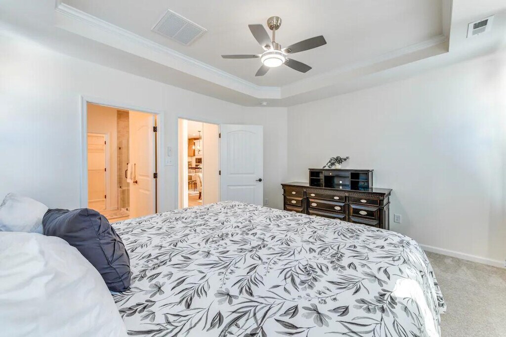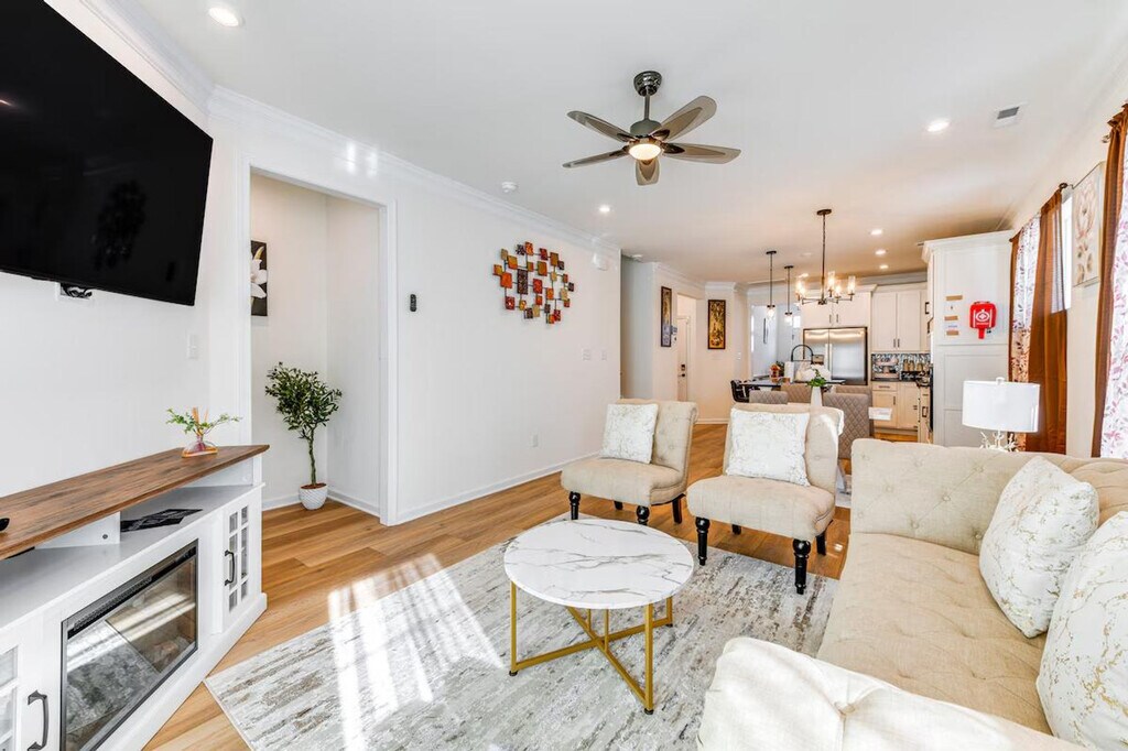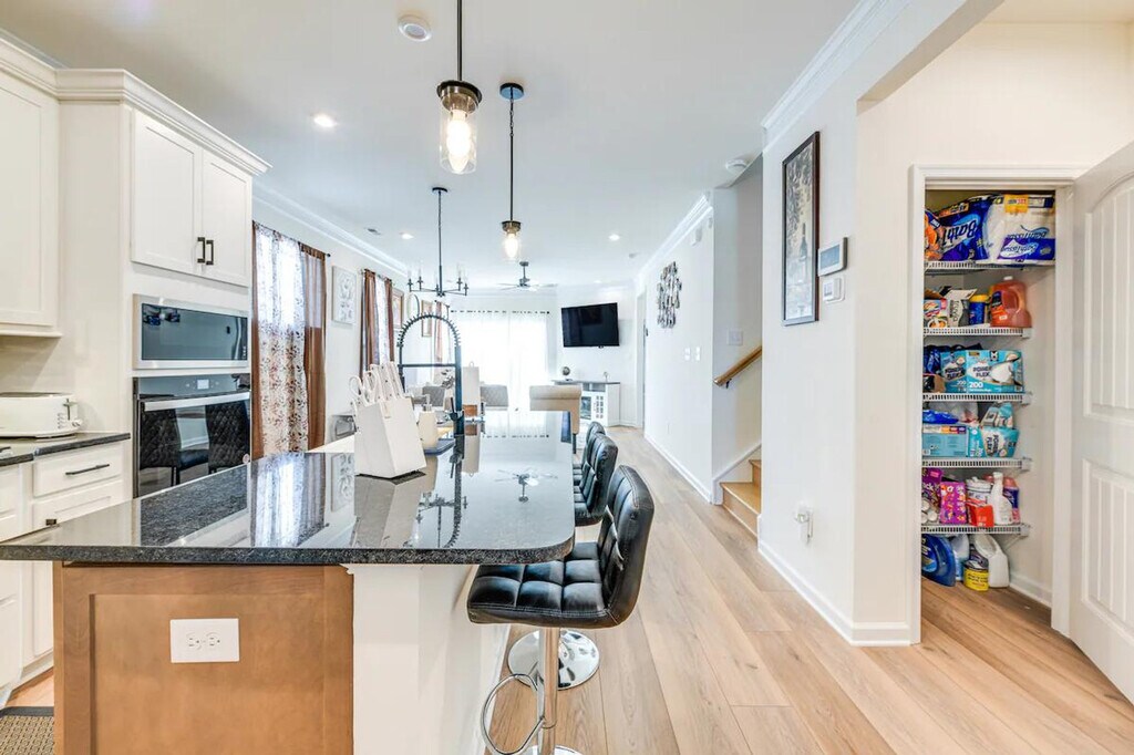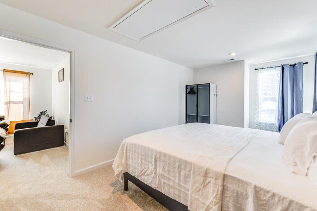 Feel at home in this Richmond escape, a 2-story home requiring 6 steps to enter, offering 5 bedrooms and 2.5 bathrooms. A bedroom and full bathroom are located on the first floor. This home features 2 flat-screen TVs, a PlayStation 5, a dining table, and a fully stocked kitchen with a cooktop, oven, refrigerator, dishwasher, cooking basics, a Keurig coffee maker, and a microwave. It also includes complimentary breakfast, free Wi-Fi, central air conditioning and heating, ceiling fans, a washer and dryer, linens and towels, and a hair dryer. Enjoy the outdoor deck with seating and dining. Parking is available in the garage for one standard vehicle, street parking for one vehicle in front of the house, and community parking for one vehicle on a first-come, first-served basis a short walk away. Spend the day touring the Maymont estate, kayaking on the James River, and exploring the many nearby museums before heading downtown to shop at the boutiques. This is a non-smoking property, and no pets, events, parties, or large gatherings are allowed. This property features 2 exterior security cameras. Camera 1 is located by the front door facing the front entry, and camera 2 is located on the back of the house facing the backyard. The cameras do not look into any interior spaces and record video and sound when activated by motion. Additional fees and taxes may apply, and a photo ID may be required upon check-in. [SI]