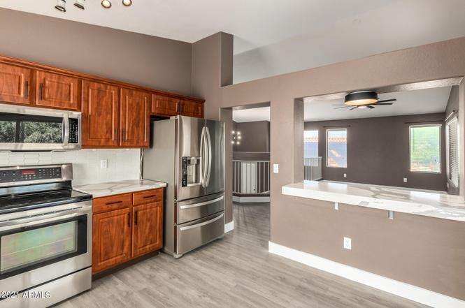 Don't miss your chance to live in a beautiful Three bedrooms Furnished Home home located near shopping spots, schools, hotels, & much more! Welcoming interior is filled w/lots of natural light, handsome brand new wood-look floors, & vaulted ceilings. Well-kept kitchen is fully equipped with stylish quartz counter tops, tile back-splash, gorgeous cabinetry, breakfast bar, track lighting, & all the essential appliances that allow you inner chef shine. The primary bedroom comes w/incredible views & lavish en suite w/dual sinks & walk-in closet. Enjoy your gatherings in this huge backyard w/covered patio, grassy/turf area, fire-pit, & sparkling blue pool. Comes with home warranty. Stop searching and start calling to book your showing today!