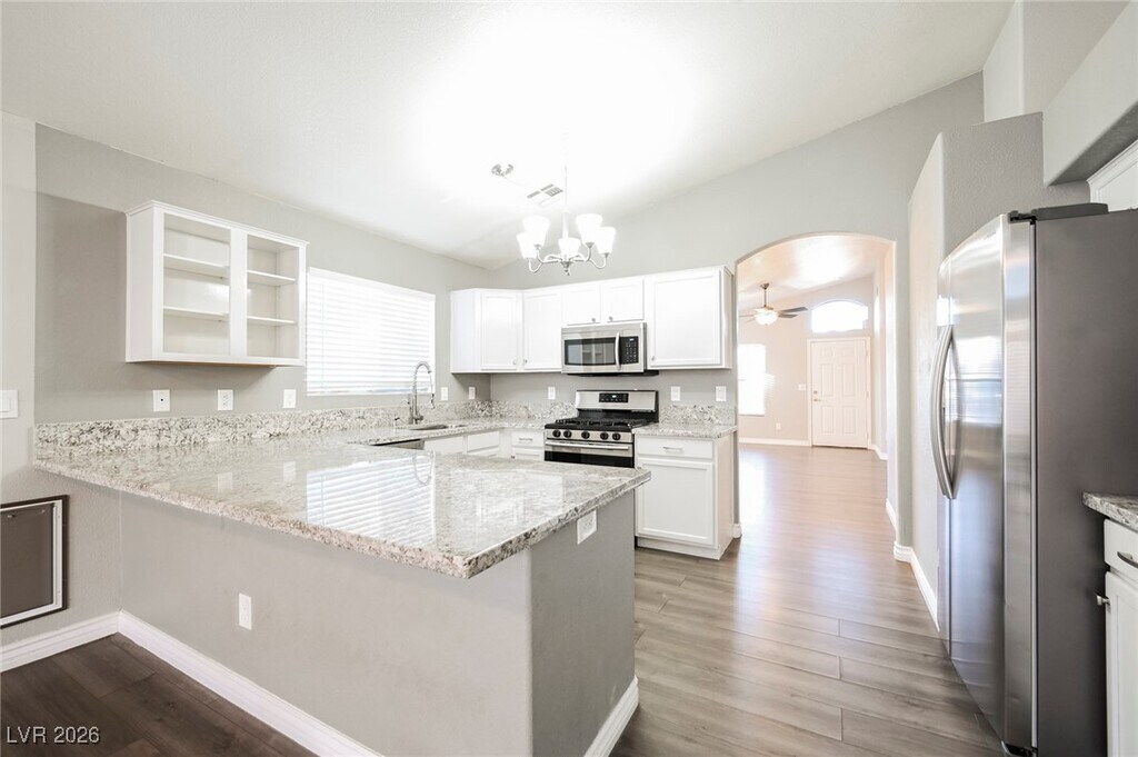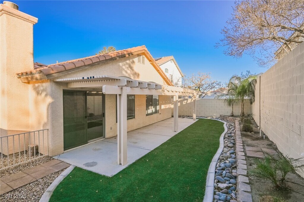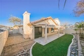 Gorgeous 3BR/2BA SINGLE STORY IN SILVERADO RANCH! Nestled within a great community this home features modern wood tile flooring, base molding, living room w/tiled fireplace & sliding glass door to backyard provides a great layout & functional space. Kitchen is focal point...Upgraded & modern W/all SS appliances & fixtures, beautiful matching stone countertops throughout and under mount sink! Spacious primary bedroom w/ high ceilings, walk-in closet & plenty of natural light. Bathroom off of primary bedroom has beautifully tiled walk-in shower.. BACKYARD BEAUTY! Covered patio landscaped w/ pet-friendly synthetic grass, curbing, large stones & pavers leading to the fully fenced in dog run. All of this PLUS close to Henderson Executive Airport, LV Raiders Headquarters, Starbucks, shopping, & more...Many upgrades & a modern aesthetic that are sure to please so schedule your showing today!