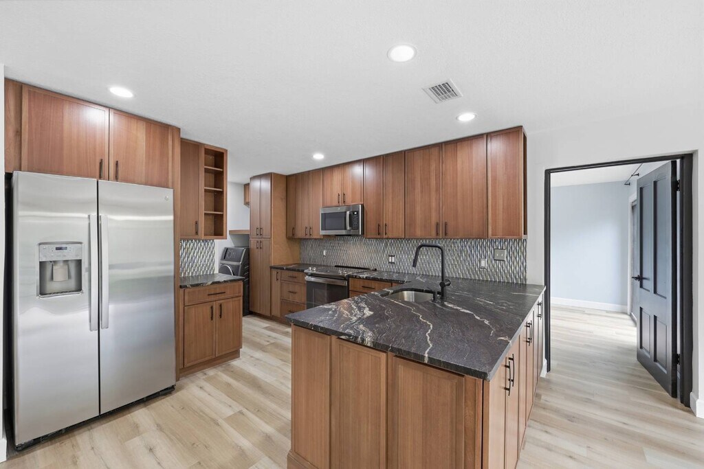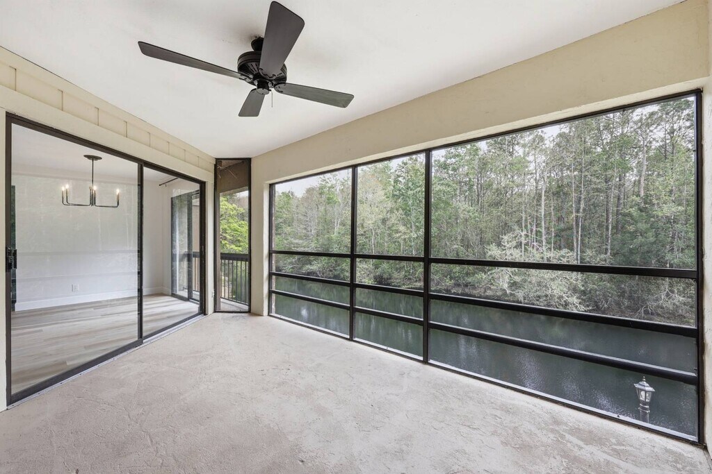 Ready to elevate your rental expectations? This fully remodeled Southside condo delivers a high-end living experience with designer finishes and thoughtful upgrades throughout. From the moment you enter, you're drawn to a stunning wall of glass showcasing peaceful lake and preserve views, filling the space with natural light and a sense of calm. The custom kitchen is as functional as it is beautiful, featuring rich walnut-finish cabinetry with sleek, modern lines, leathered granite countertops, stainless steel appliances, and a striking iridescent glass backsplash. Storage has been maximized at every turn, with a modern washer and dryer thoughtfully tucked away out of sight. Both bathrooms have been completely transformed with spa-inspired walk-in showers and rain head systems, blending everyday comfort with contemporary design. Each bedroom offers generous space, while the primary suite features a custom built-in closet system. Luxury vinyl plank flooring runs throughout, tying the entire home together with a clean, modern feel. Every detail has been carefully curated, this is not your average rental. Take a look through the photos, then schedule your private showing to experience it in person.
