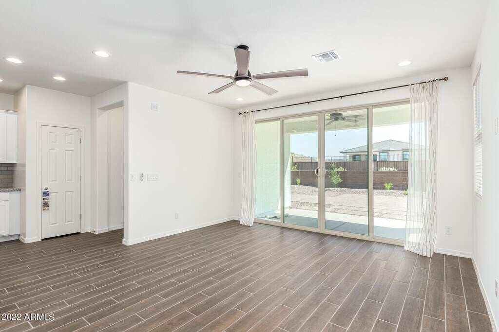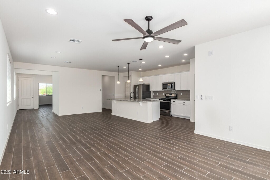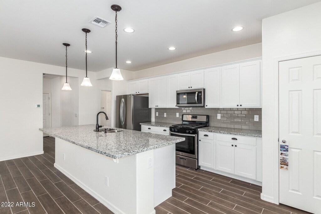 650 minimum credit required for this like new home. New popular Estrella Mountain Ranch community of Lucero...just finished construction in 2022. 3 bedrooms plus a nice den. Gorgeous flooring and upgraded kitchen counter tops. Living area is large as well! Experience the incredible Estrella amenities for just a one time fee of only $100 (lakes,gyms,pools,biking trails,etc). Tenant must maintain tenant insurance during their tenancy. No Pets.