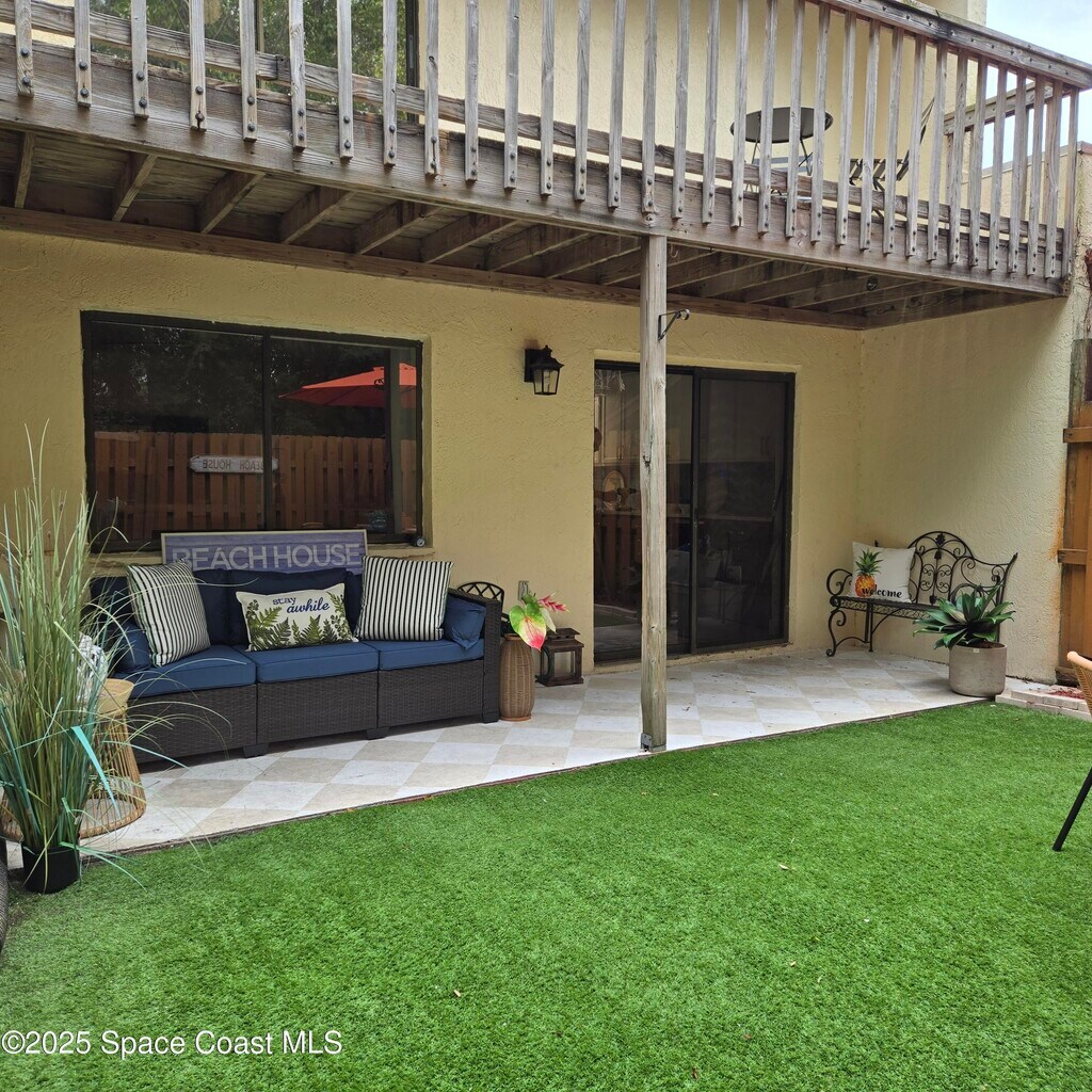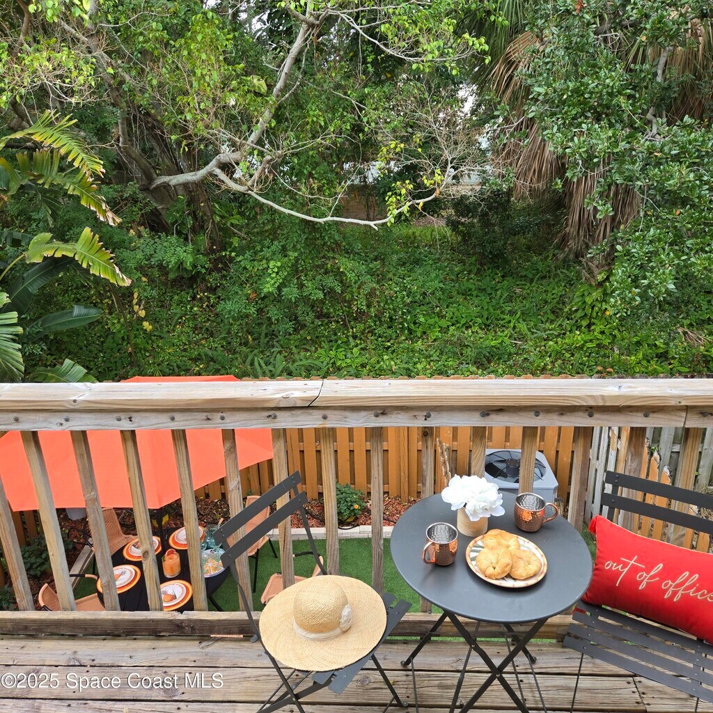 Nestled in the trees,this hideaway is the perfect place to relax and unwind on your next vacation. Just about a seven minute walk along a shady nature trail to Peacock Beach on the Atlantic Ocean,this 3 bedroom,2.5 bath garage townhome features a fenced back yard surrounded by lush tropical landscaping. The entry foyer welcomes you into a spacious Dining room with seating for six and leads you into a bright and sunny Living room with access leading to the private back yard with both casual seating and outdoor dining. Adjoining the Living room is a newly renovated and expanded gourmet kitchen featuring granite counters,stainless appliances,a built-in wine cooler and breakfast bar. Fully equipped for dining and entertaining including a blender,coffee maker/espresso,panini press and gas grill in the back yard. The first floor also offers a convenient powder room and direct access to the garage. The upper level offers a primary suite with a King sized bed and entry onto a balcony spanning the width of the house and overlooking the back yard,a large custom walk-in closet and a newly renovated bath with walk-in shower. The second bedroom offers a Queen sized bed and the third bedroom has a Twin daybed,which can convert to a King if needed. Both bedrooms feature custom closets and share a newly renovated bath located next to the upstairs Laundry room. Freshly decorated with a very tropical island motif you'll feel as if you've been transported to paradise. Not only are linens and towels provided but so are beach chairs,umbrellas,a beach cart and a selection of sports and beach accessories. Should you need to work remotely,high-speed internet and Roku streaming TV are provided. With an assigned parking space just steps away from the garage,this home offers parking for two cars. Ocean Woods is a gated community featuring a canopy of mature Live Oak trees and tropical landscaping along with two heated pools (one adult and one family),a clubhouse with sauna,shuffleboard,tennis,pickleball,basketball and racquetball and a population of peacocks roaming the grounds. Just 2.5 miles to Port Canaveral with an array of eateries,water sports and cruise opportunities,15 miles to Kennedy Space Center and 11 miles to Historic Cocoa Village on the Indian River and the renowned Cocoa Village Playhouse. You'll never lack for interesting activities to experience including watching rocket launches from the beach or a visit to the Historic Cocoa Beach Pier. Conveniently located approximately 45 minutes from either Orlando or Melbourne Airport and approximately 60 minutes from Disney and Universal Studio theme parks. Minimum 28 day stay is required by the Ocean Woods Condo community. We hope that you'll enjoy your stay!