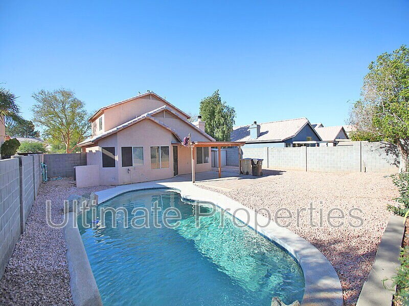 This stunning 3-bedroom, 3-bathroom home offers the perfect blend of style and comfort. Soaring vaulted ceilings create an impressive sense of space, while the cozy fireplace adds warmth and ambiance. The well-appointed kitchen boasts a sleek tiled backsplash, convenient island, and complete stainless steel appliance package including range/oven, dishwasher, microwave, and refrigerator. Entertain with ease in the spacious living area featuring attractive built-in shelving. Retreat to the luxurious master suite with dual sinks, shower/tub combination, and generous walk-in closet. Your private backyard paradise awaits with a sparkling swimming pool, covered patio for year-round enjoyment, and elegant paver stonework—ideal for Arizona outdoor living! Pet Details: All Pets Allowed
