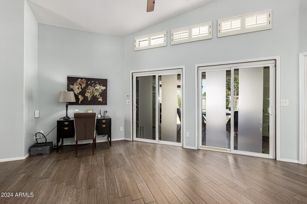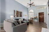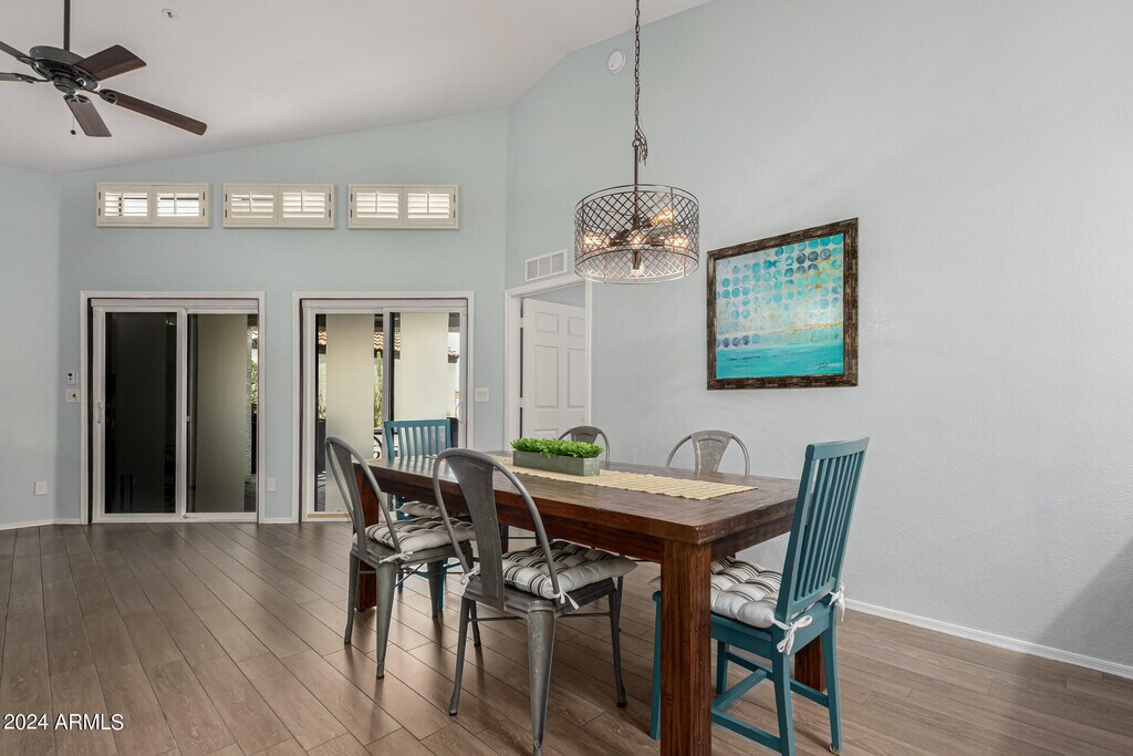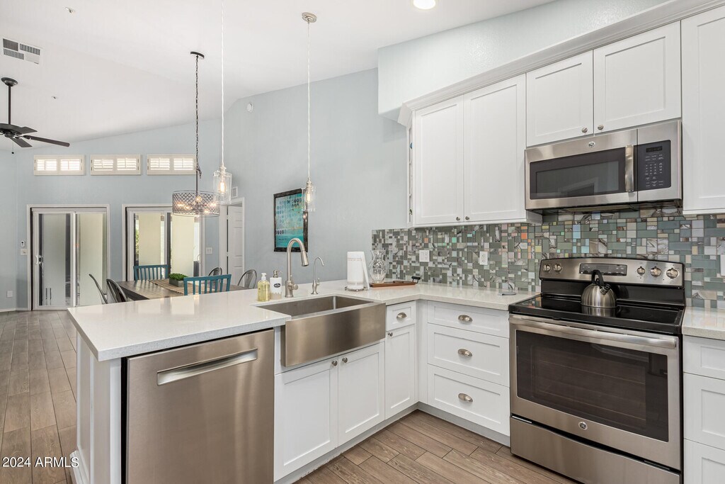 Seize the opportunity to rent this charming 3-bedroom,2-bath residence in Arabian Gardens! Discover a welcoming living room with soaring vaulted ceilings,a relaxing palette,plantation shutters,unique half-moon windows,and attractive wood-look flooring. The eat-in kitchen boasts skylights for ample natural light,quartz counters,white shaker cabinets with crown moulding,pendant/recessed lighting,a stylish tile backsplash,a pantry,and a peninsula with a breakfast bar for quick meals. The main bedroom features soft carpeting,direct backyard access,an ensuite with dual sinks,and a walk-in closet. Venture outside to a lovely backyard,showcasing a covered patio,well-laid pavers,and a cozy firepit for evenings under the stars. Don't miss this gem!