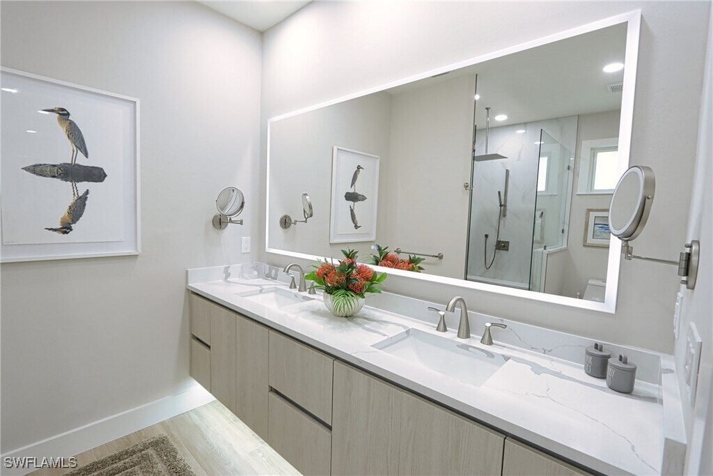 Absolutely stunning completely renovated home in the sought-after community of Ventura in Pelican Marsh. This contemporary home features wood floors,in living areas,great room floor plan with large kitchen island,custom cabinets,beautiful carpentry,designer furnishings,and much more! Come enjoy your season with a fully equipped kitchen,dining area for 4,elegant living area with large flat screen TV. Master suite with walk-in closet,onsite bathroom with a shower only. Both guest suites feature queen beds,Tv’s,and share guest bathroom with shower only. You can entertain pool side with built-in grill and plenty of seating on your screened in lanai. Pool and spa are heated. This house has a laundry room,two car garage,cable and WIFI for your convenience. Pelican Marsh has fabulous amenities to include miles of biking and walking trails,a state-of-the-art fitness center,tennis,patio bar and grill,and proximity to everything from the beach to fine dining.