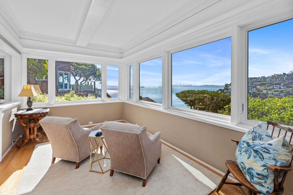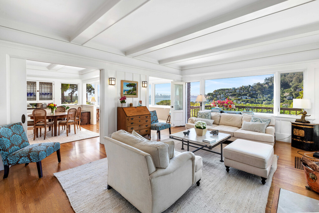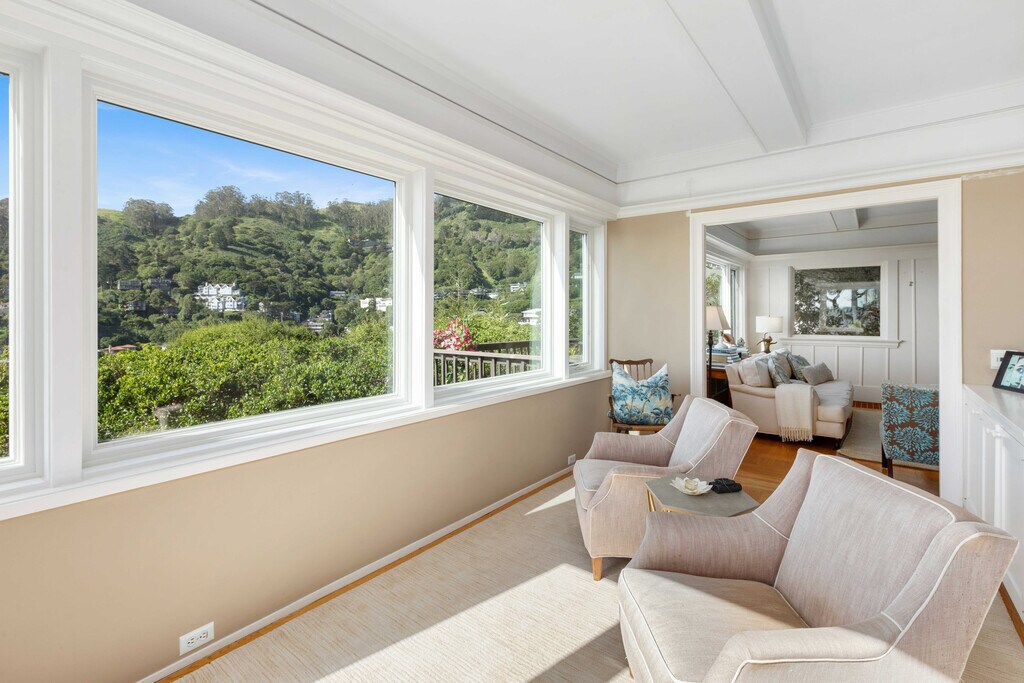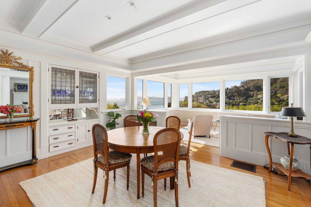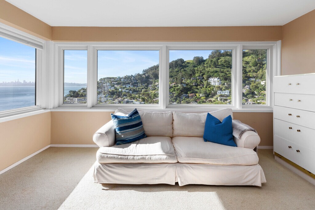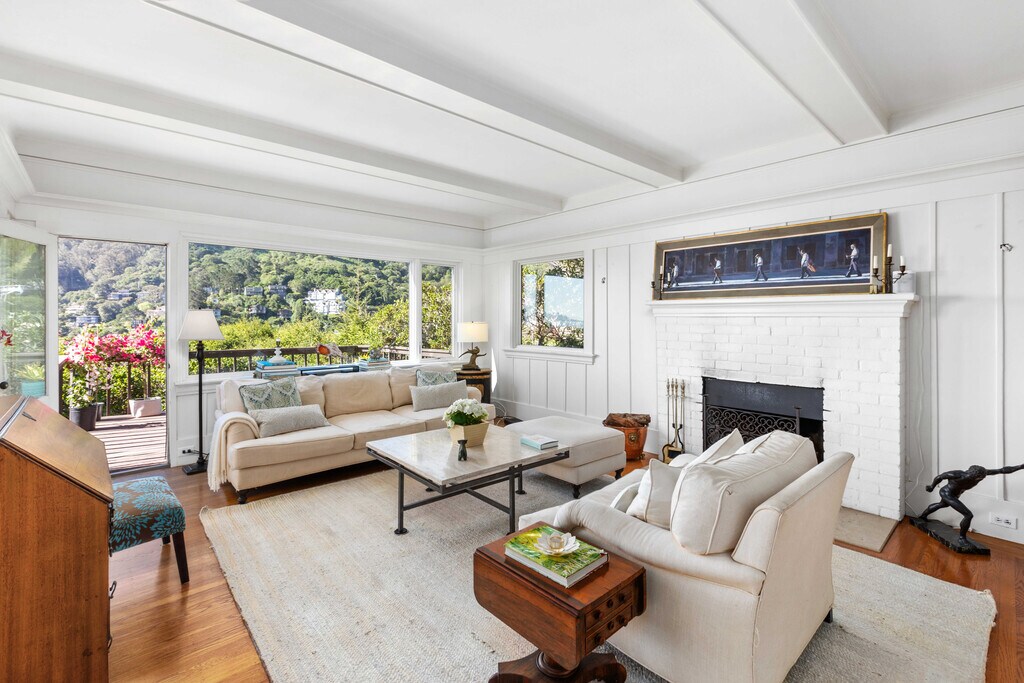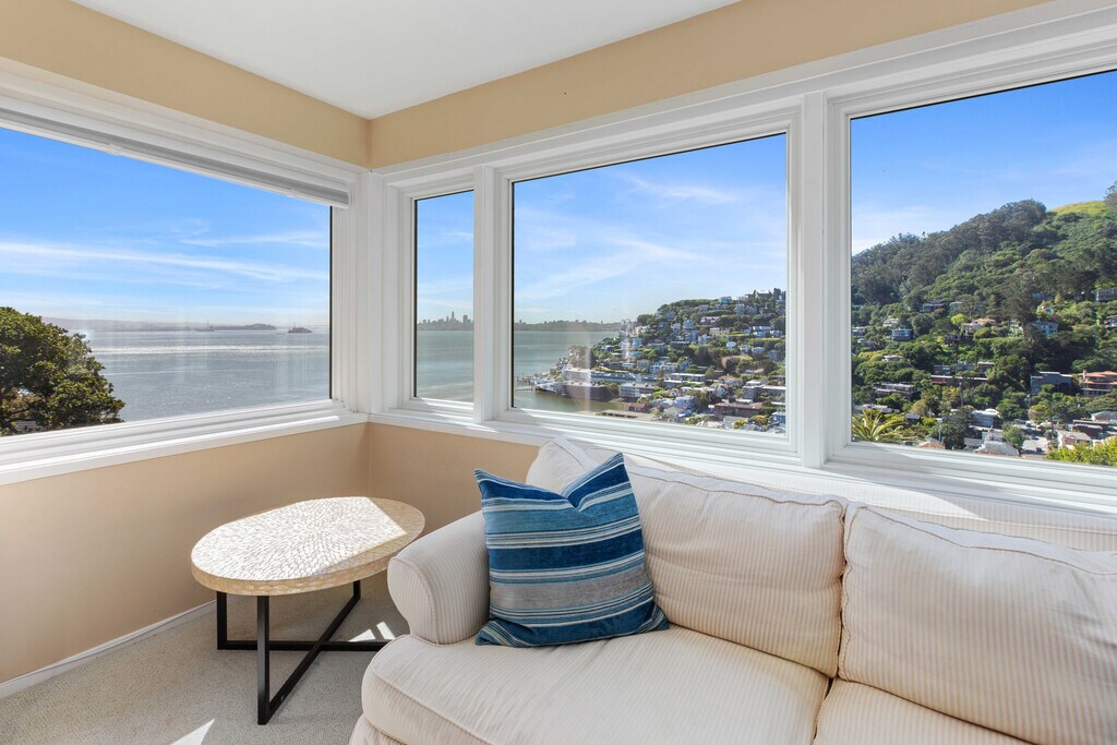 Step into a timeless sanctuary. This sophisticated home, nestled on a private hillside in Sausalito's prestigious "The Hill'' community, will capture your heart. Imagine waking up to coveted panoramic views of the Bay and San Francisco skyline - a vista that graces nearly every window. The main floor unfolds like an entertainer's dream. Light streams through the open floor plan, highlighting oak hardwood floors and a wood-burning fireplace. Unleash your inner chef in the light-filled kitchen, boasting granite countertops, high-end appliances, and an abundance of cabinets. Adjacent, a formal dining room with leaded glass cabinetry awaits elegant gatherings, while a cozy sitting room beckons for intimate soirees with the twinkling city lights as your backdrop. Step outside onto the expansive wood deck, where sunshine, relaxation, and unparalleled water views converge. A conveniently located laundry room and half bath complete the main floor. Ascend the stairs to discover your private haven. The spacious primary suite, a true sanctuary, boasts a sitting area that invites you to lose yourself in the Bay's beauty. Two additional bedrooms and a full bathroom provide ample living space for all. Location is everything, and this home delivers. Situated just steps from the Julia Morgan-designed Sausalito Woman's Clubhouse, a historic treasure. A short stroll brings you to Sausalito's charming town center, with its enticing restaurants, the Sausalito Ferry, Golden Gate Market, and Southview Park. An easy commute to San Francisco adds the perfect finishing touch to this idyllic lifestyle. Home is offered unfurnished, furnished or partially furnished. Listed price does not include furniture. Pets will be considered. Please do not disturb occupants. Offering a $2,000 brokers fee! Easy to show! Please call for a private showing and with any questions. Charity Smart Marker Luxury Properties DRE 02024353