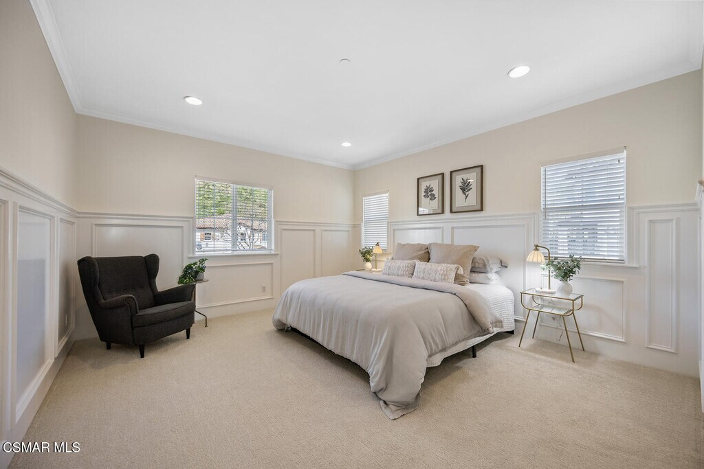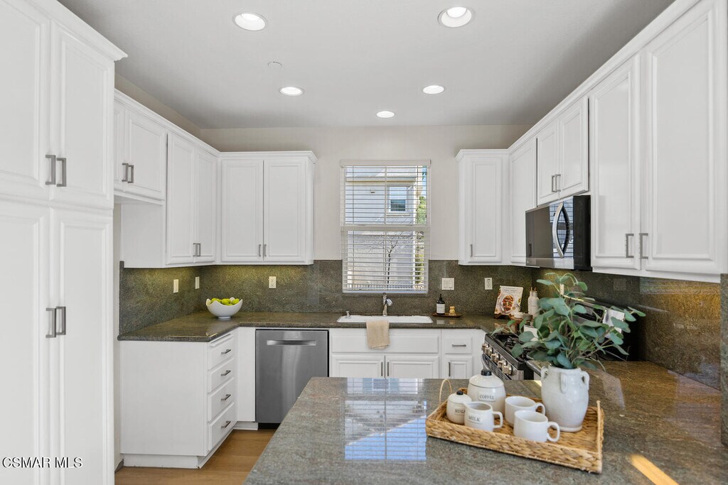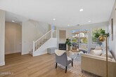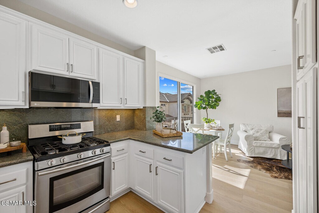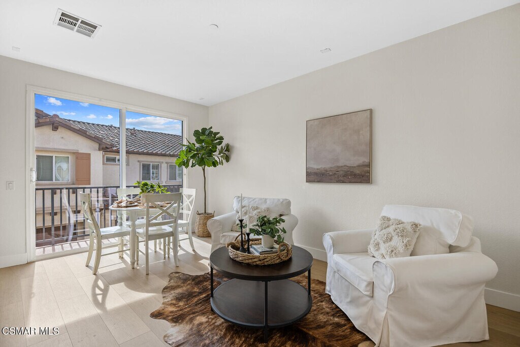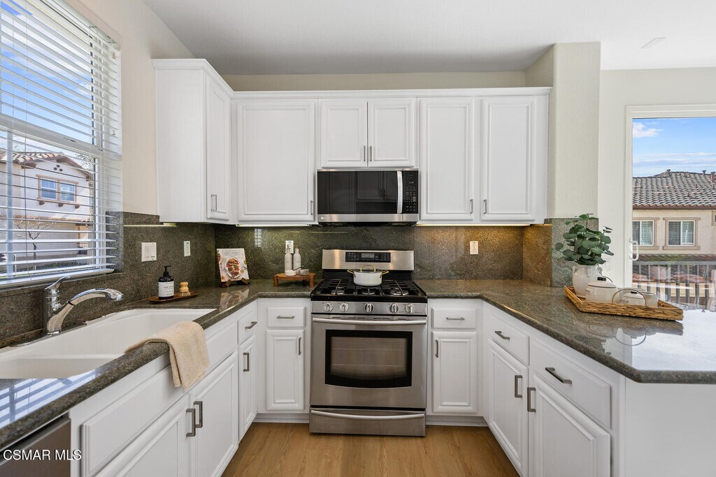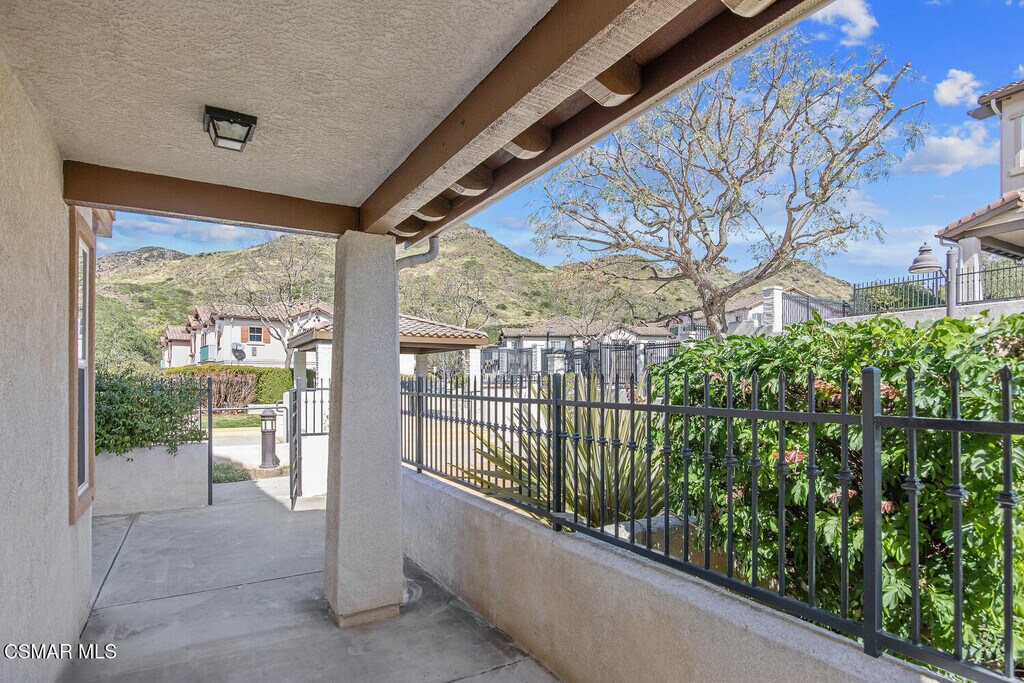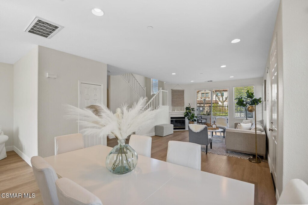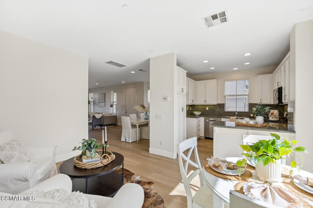 Ready to move in Aldea end unit with a view! This bright and spacious home has recently been updated. The main living area presents you with a large living room with fireplace, dining area, den, and kitchen with white cabinetry, granite countertops, stainless steel appliances and a balcony by the den. The relaxing front patio has views of the mountains. The guest bath completes this level. The upper level offers the primary suite with an ensuite bathroom it has dual vanities, soaking tub and separate shower. Walk-in closet. Two additional bedrooms share a recently remodeled full bathroom. All the bedrooms enjoy peak a boo view of the mountains. The entire first level has been upgraded with luxury laminate plank flooring. Upstairs has new carpeting. This unit has been freshly painted throughout. The unit features a spacious attached two-car garage on the lower level, complete with washer and dryer hookups and ample room for additional storage. Aldea Dos Vientos Townhomes provides two pools, spas, and a clubhouse. The Via Katrina pool has breathtaking views of the mountains. Aldea is adjacent to Sycamore Park & The Village Town Center. It is located in close proximity to Sycamore Canyon K-8 School, one of Ventura County's top rated schools and very close to the Dos Vientos Community Center.
