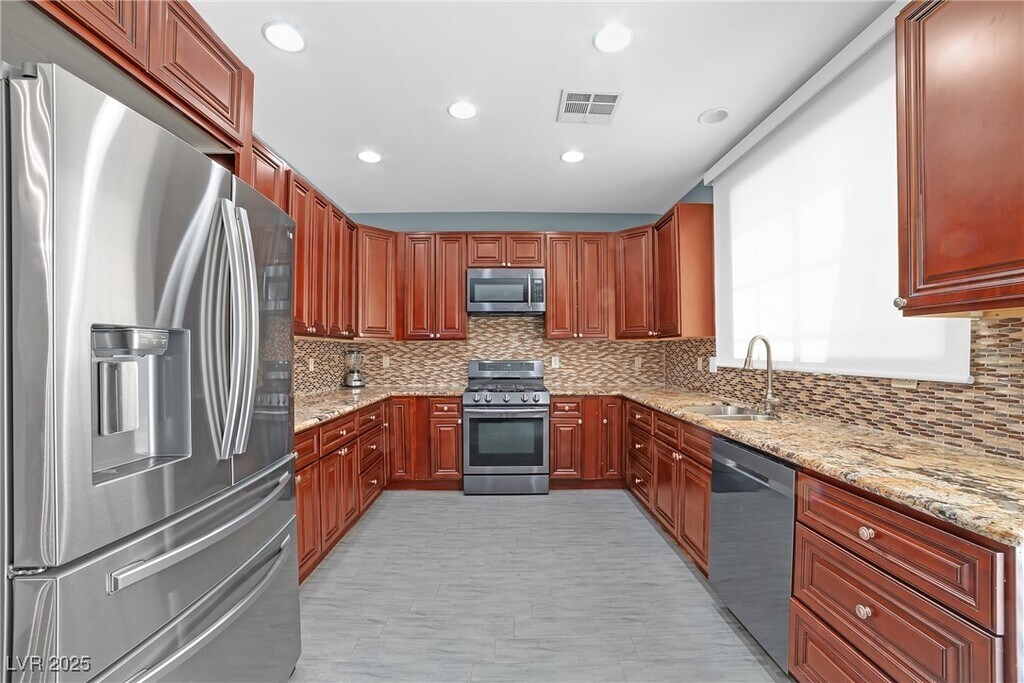 Come explore this stunning fully furnished two-story home located in the desirable Northwest area of Las Vegas! Featuring 4 spacious bedrooms, 2.5 bathrooms, a 2-car garage, and convenient RV parking, this home perfectly blends comfort and functionality. Step inside to find a bright, open layout with beautiful laminate wood-like and tile flooring throughout. The modern kitchen is equipped with stainless steel appliances, granite countertops, and ample cabinet space—ideal for cooking and entertaining. Upstairs, generous bedrooms offer plenty of space for relaxation. The laundry room comes complete with cabinetry and a washer and dryer for added convenience. Outside, enjoy low-maintenance landscaping and a covered patio perfect for outdoor dining or unwinding after a long day. With its thoughtful design and stylish finishes, this home offers the best of modern Las Vegas living—move-in ready and waiting for you to call it home!