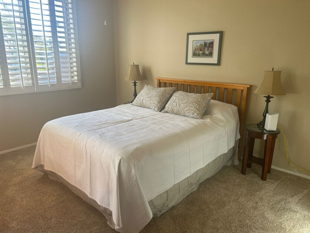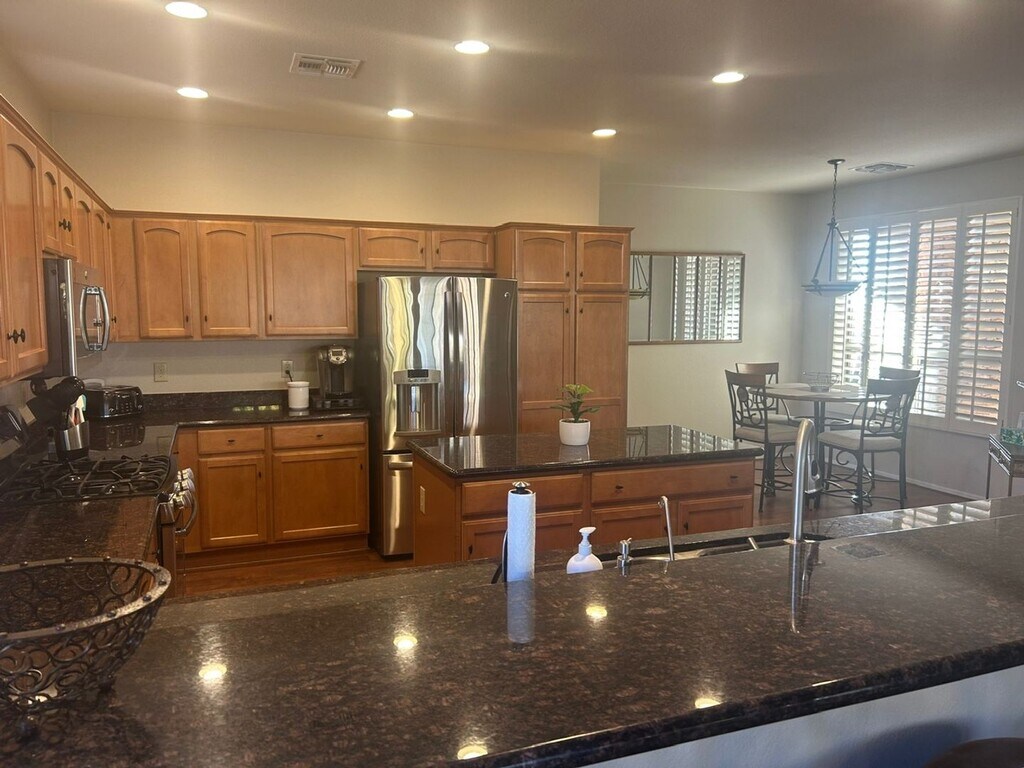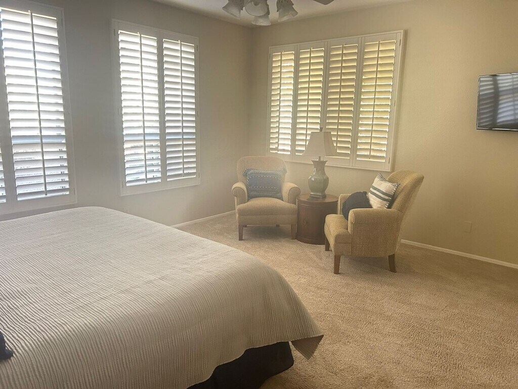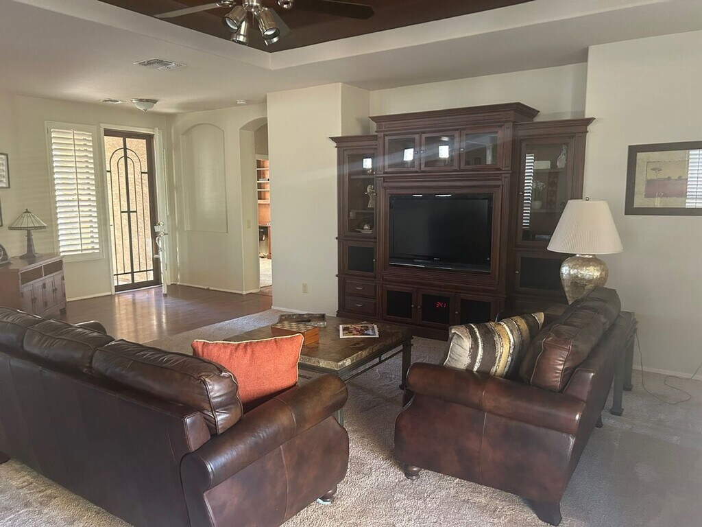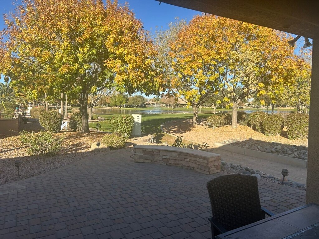 This 2 bedroom 2 bath spacious home sits on a great waterfront lot in the gated Oakwood community of Sun Lakes. Large open kitchen overlooks the living and formal dining area, with a large island and plenty of storage. The Primary bedroom is large with additional sitting area and spacious walk in closet. There is also a large den with built in desks to work from home. The covered patio has a built in BBQ grill with a great view of the lake, which is great for entertaining or just relaxing. Property is fully furnished and available as a short term rental starting 5/4/26 through 11/15/26.