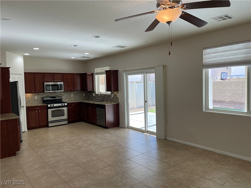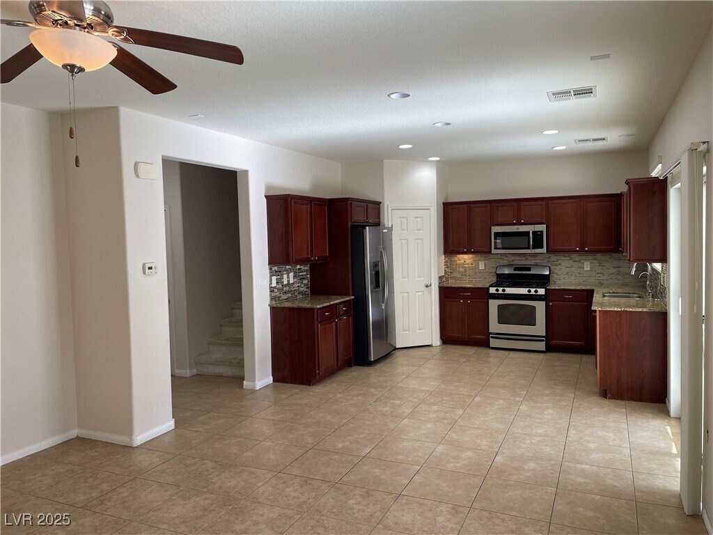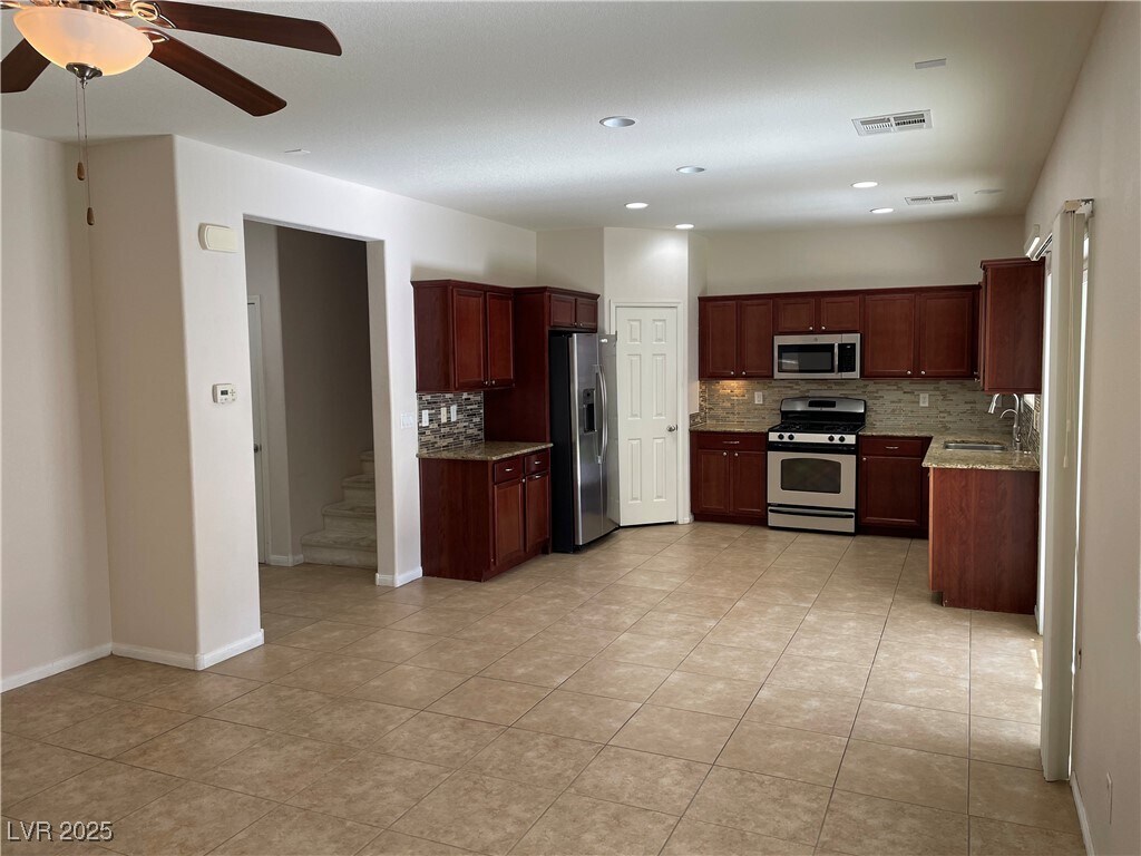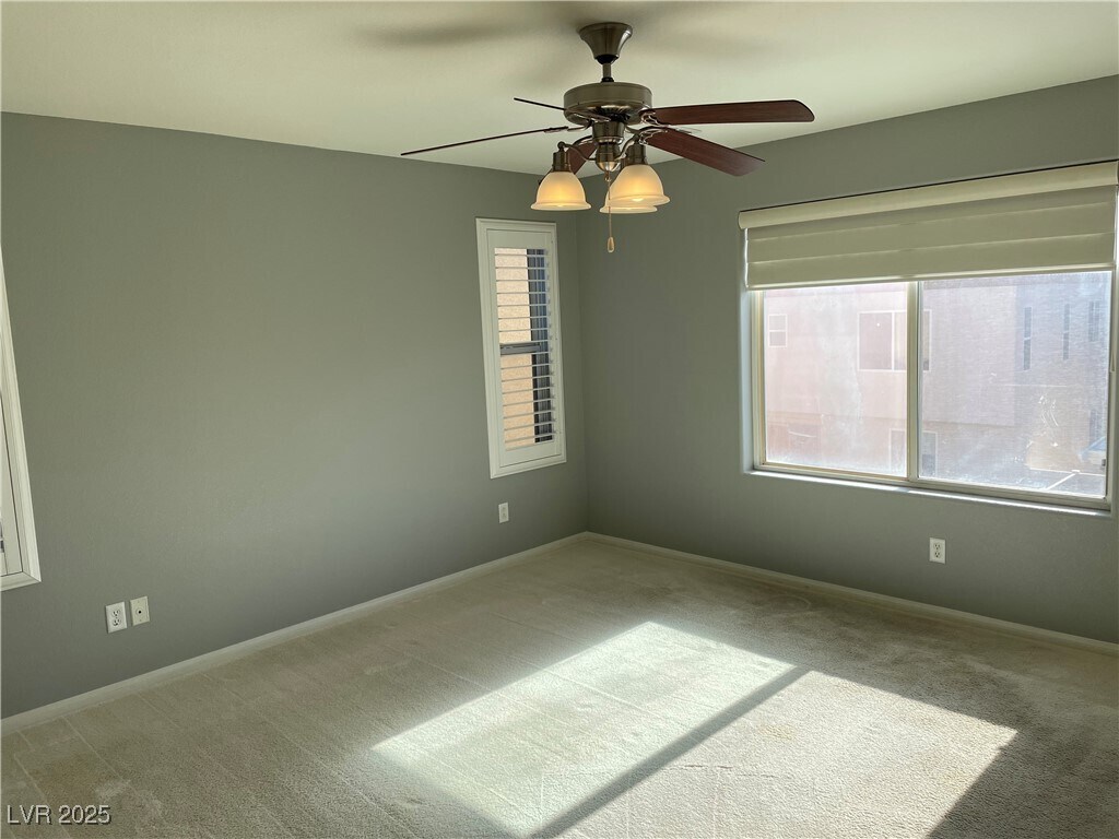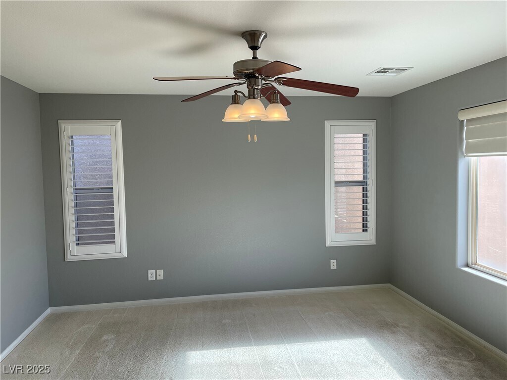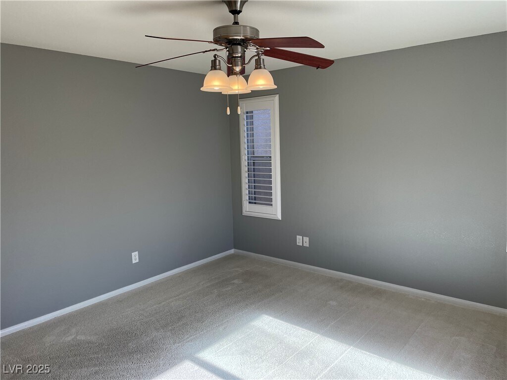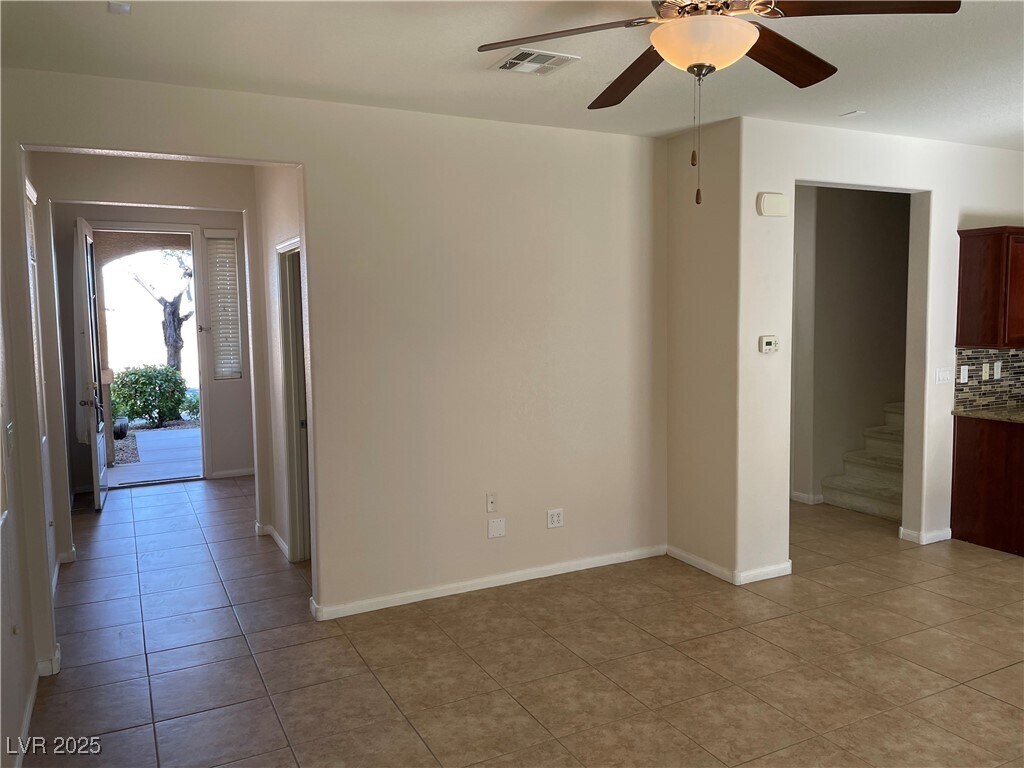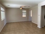 This three-bedroom home features an open floor plan on the first floor combining the living room, kitchen and dining area with 9' ceilings and ceramic tile. The kitchen features stainless steel appliances, granite countertops and maple cabinets. There is also a half bath downstairs. In addition to three bedrooms with ceiling fans, carpet and premium window treatments, the upstairs features a loft, laundry room and two full bathrooms. The primary bathroom features a separate tub and shower, dual sinks and a walk-in closet. The garage includes overhead storage and storage cabinets and features direct access into the downstairs foyer with additional cabinet and counter space. The backyard includes a 25' covered patio as well as low maintenance synthetic turf.