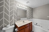 Beautiful end-of-group townhouse residence offering 3 bedrooms, 2 full baths, 2 half baths, 2,120 finished square feet, and a 1-car garage available for lease in desirable Howards Ridge. Step inside the welcoming foyer with a convenient powder room, then ascend to the main level where a charming, sunlit kitchen awaits. Thoughtfully appointed with stainless steel appliances, a custom backsplash, a pantry, and space for a cozy breakfast table, the kitchen also features a pass-through window that opens seamlessly to the main living areas. Hardwood floors extend throughout this level, enhancing the home’s warm and inviting feel. The formal dining room and living room offer an open-concept layout while remaining subtly defined by architectural details, including a divider and a step down into the living room. This spacious area provides direct access to the expansive deck overlooking the shared backyard. Upstairs, three comfortable bedrooms and two full bathrooms include a spacious primary suite with soaring vaulted ceilings, a private ensuite bath featuring a jetted soaking tub, a walk-in closet, and a versatile loft area ideal for a sitting room or home office, complete with an additional walk-in closet for added storage. The fully finished walk-out lower level offers a generous recreation room with double closets, a powder room, and a laundry closet.