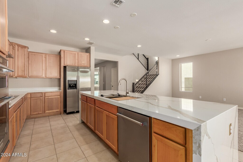 Prepare to be captivated by this massive 5-bedroom,3.5-bathroom home! Built in 2022,this newer home offers all the space and upgrades you need. High ceilings and large windows create a light and bright ambiance throughout. The spacious kitchen boasts gorgeous quartz countertops,stainless steel appliances,and a large kitchen island overlooking the family room. Enjoy meals in the dining nook with direct views of the backyard. The floor plan includes a lovely in-law suite on the first floor,along with the primary suite and a dedicated office/den space. Upstairs,you'll find three additional bedrooms with walk-in closets and a huge loft area. Community features include a sparkling pool,recreation center,parks,and playgrounds,making this an ideal neighborhood in Glendale.