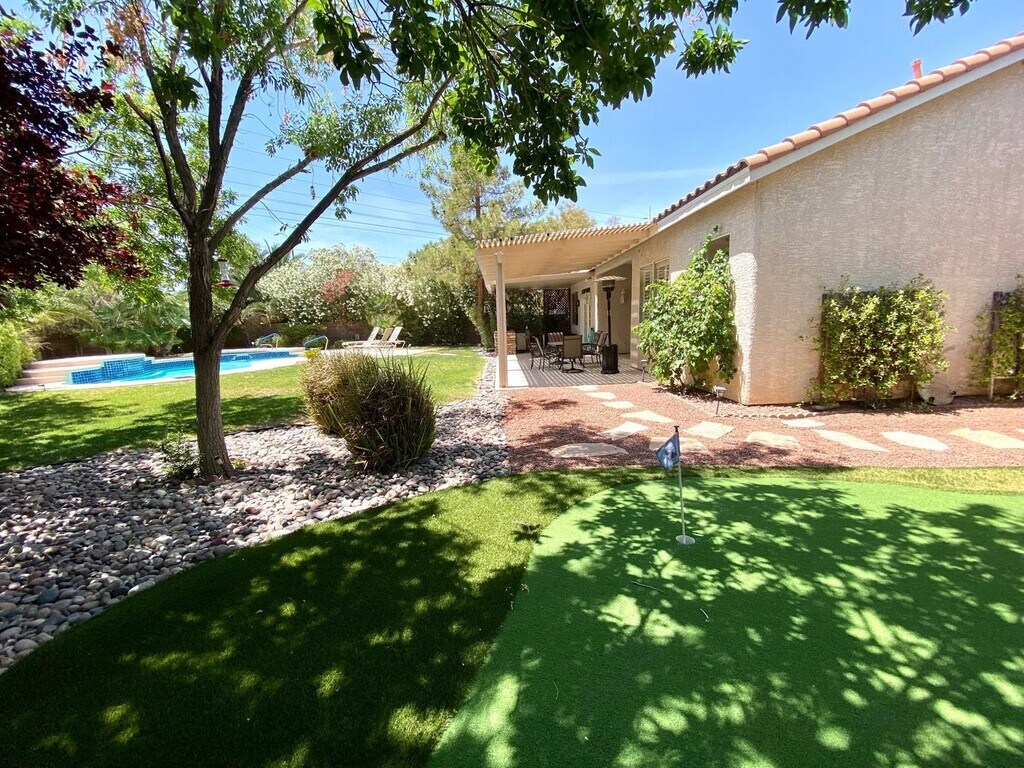 Furnished 4 Bedroom Pool Home. This one-story home offers a spacious layout with four bedrooms (one room is an office, no closet, furnished with a bed) and three full bathrooms, perfect for those seeking ample living space. Bedrooms are spaced so there is no common walls between. The home comes furnished, but you will need to bring your linens and housewares. The property boasts a three-car garage, providing plenty of space for your vehicles or additional storage. Step outside to a covered patio, a perfect spot for outdoor dining or relaxation. For golf enthusiasts, the home even features a private putting green, allowing you to practice your swing without leaving your backyard. The highlight of this property is undoubtedly the large spacious yard with private pool and spa. This home is available for a 6-month lease, providing flexibility for your living arrangements. Shorter term may be available for higher monthly- call to discuss. Pets on case by case basis with additonal deposits required. Conveniently located within a short commute to the 215 freeway , from the Las Vegas airport and of course- the famous Las Vegas Strip! Property to be self- managed by owner of record.