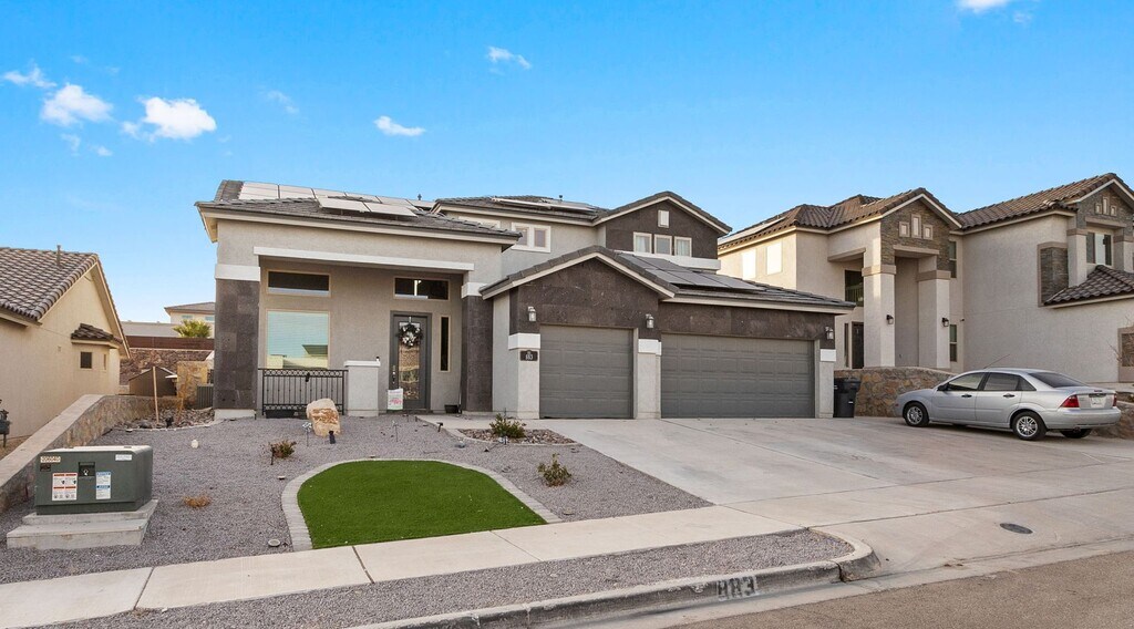 Welcome to an exceptional opportunity to lease in the prestigious Americas Estates on El Paso's coveted East Side. Inside, an open-concept living area bathed in natural light features a cozy fireplace and flows seamlessly into a chef's kitchen, creating the perfect environment for entertaining. The primary suite, conveniently located on the first floor, offers a peaceful private retreat. Step outside to your personal oasis—a meticulously landscaped backyard with a sparkling pool, ideal for relaxation and hosting gatherings. Embrace significant energy savings with 44 owned solar panels, and enjoy the convenience of a spacious 3-car garage equipped with a Tesla EV charger. Perfectly situated, you're just minutes from top schools, shopping, dining, and entertainment, with easy access to Loop 375, I-10, and Fort Bliss. This home truly combines elegant living with practical, modern perks. *All residents are enrolled in the Resident Benefits Kit (RBK) which includes liability insurance, credit building to help boost the resident's credit score with timely rent payments, up to $1M Identity Theft Protection, HVAC air filter delivery, move-in concierge service making utility connection and home service setup a breeze during your move-in, our best-in-class resident rewards program, and much more!*