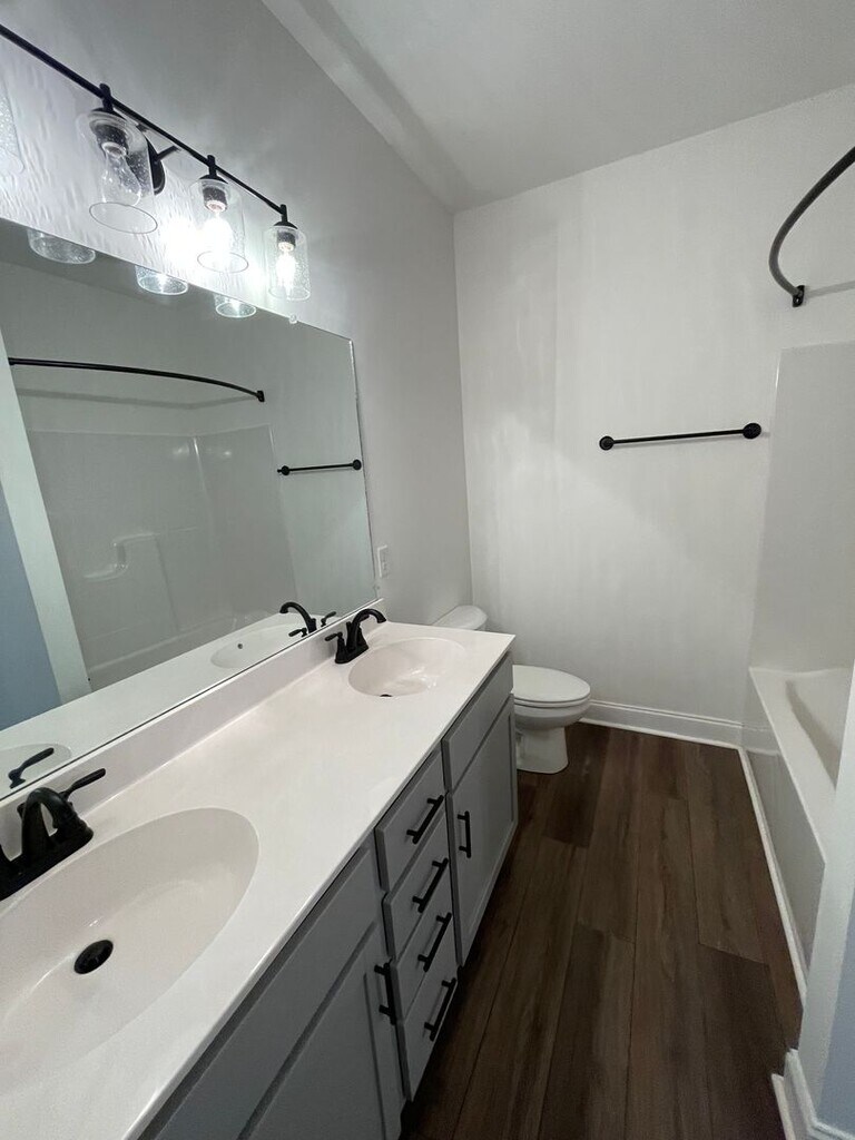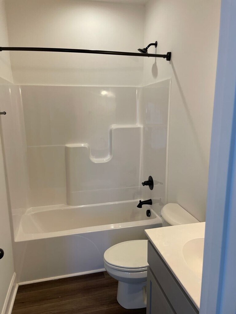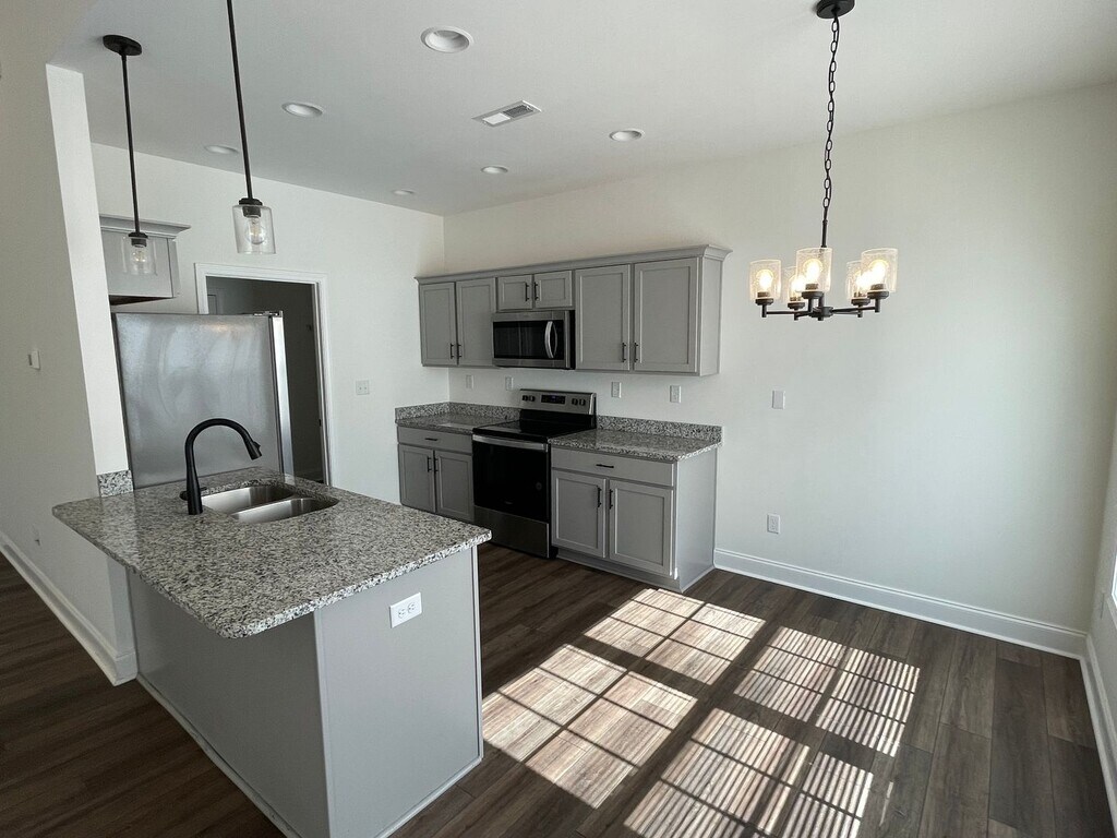 New construction single family home Attached 2-car garage Granite countertops Stainless steel appliances LVT flooring throughout Vaulted ceiling in living room Pantry Side-by-side washer dryer connections Walk-in closet in master bedroom Double sink vanity in master bedroom