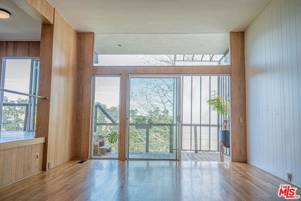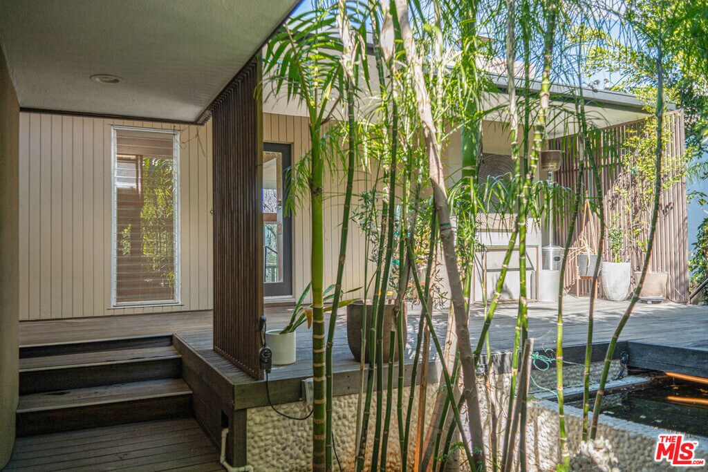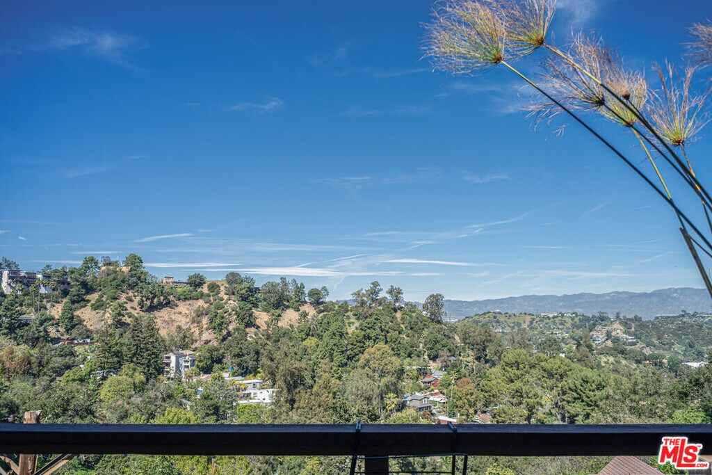 Perched on the crest between historic Laurel Canyon and Sunset Plaza, this classic mid-century post-and-beam retreat captures the very essence of Westside canyon living in the coveted Hollywood Hills.Featured in Dwell, this private and gated treehouse-style oasis welcomes you with a mahogany-planked forecourt and the tranquil sounds of a water feature setting the tone for a home designed equally for elevated entertaining and serene retreat. Surrounded by lush greenery and layered canyon views, the property feels worlds away, yet remains moments from the energy of the city.Inside, timeless mid-century architecture shines through oak floors, soaring ceilings, floor-to-ceiling glass, and sweeping canyon vistas from nearly every room. A stunning travertine fireplace anchors the dramatic step-down living room, creating an architectural focal point that is both warm and striking. Natural light floods the interiors, blurring the lines between indoors and out.The eat-in kitchen, outfitted with updated appliances, opens to a BBQ deck perfect for al fresco dining under the trees. A bedroom and full bath complete the main level, offering flexibility for guests or family. Upstairs, the primary suite serves as a peaceful sanctuary with its en-suite bath and private deck overlooking the hills and canyons an idyllic perch for morning coffee or sunset unwinding. An additional guest bedroom and bath complete the upper level. Exterior stairs lead to a third-level private-entry guest quarters/home office with kitchenette and bath (not included in square footage or bed/bath count), ideal as a separate in-law studio, creative workspace, or income opportunity. The attached garage provides convenience, while the expansive backyard unfolds into a true jungle-like retreat a curated array of mature trees and abundant plantings create total privacy. A tucked-away hot tub offers spa-like relaxation beneath canyon skies, with views that stretch endlessly across the hills.Just minutes from the iconic Sunset Strip, historic Hollywood, and award-winning Wonderland Avenue Elementary School, this is Laurel Canyon living at its finest architectural, soulful, private, and effortlessly California cool. MLS# 26657641