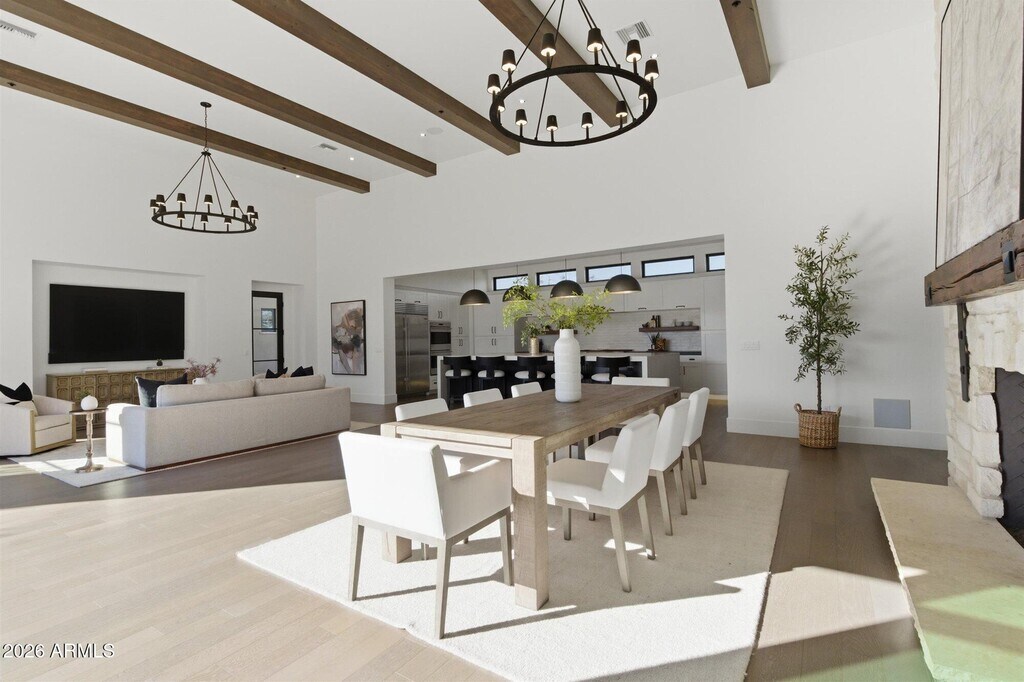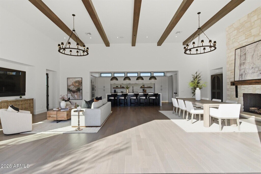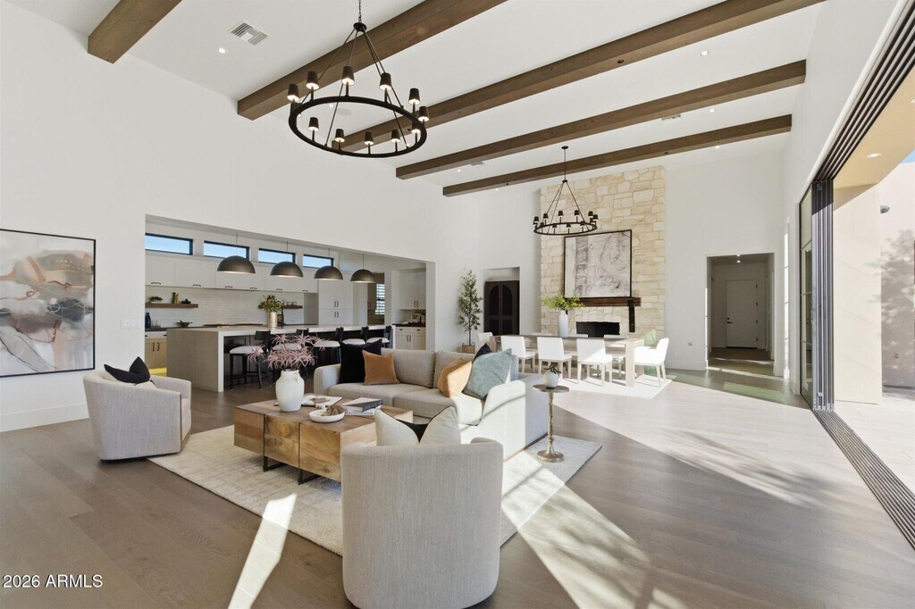 Voted BEST HOME on the Sotheby's home tour,this exquisite estate is located in Scottsdale's prestigous 85255 zip code offers an unparalleled blend of sophistication,privacy,and striking architectural beauty. Built in 2019 and remodeled in 2021,this home sits on one of the finest and largest ELEVATED lots in the prestigous White Horse,offering breathtaking views of the majestic McDowell Mountains and views of Pinnacle Peak. From the moment you arrive,the grand entryway sets the stage for impeccable design and craftsmanship. Expansive sliding glass doors and seamless indoor-outdoor living connect the great room and game room to the beautifully redesigned backyard.
