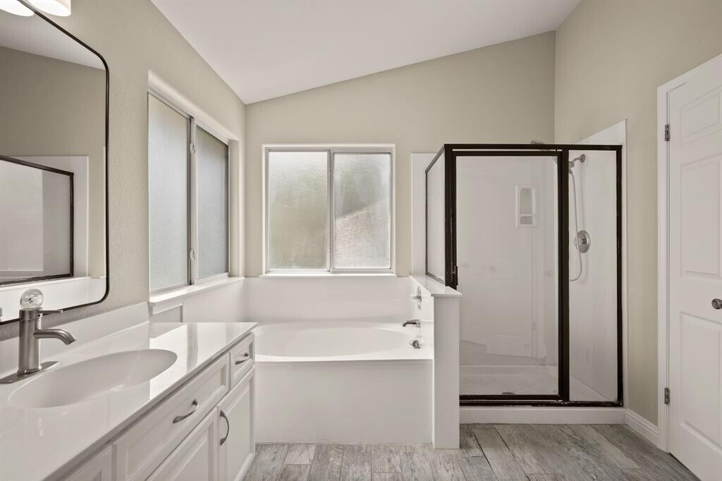 Welcome to this charming 2-story, 4-bedroom, 3.5-bath home tucked away on a quiet, friendly cul-de-sac. The inviting curb appeal and spacious, fully fenced backyard make it ideal for both everyday living and entertaining. Step inside to soaring ceilings and durable LVP flooring that flows seamlessly throughout the main level, balancing style and practicality. The living room is filled with natural light and anchored by a cozy fireplace, creating the perfect space to relax. Enjoy the versatility of two dining areas—great for casual meals or festive gatherings. The kitchen is designed for both function and flair, featuring a long breakfast bar, sleek granite countertops, stainless steel appliances, and a pantry for extra storage. With two primary suites, this home offers flexible living arrangements. The downstairs suite provides a peaceful retreat, while the upstairs suite boasts backyard views and a sense of privacy. Out back, a large patio overlooks mature trees, offering a tranquil setting for morning coffee, evening cookouts, or weekend get-togethers. Conveniently located near parks, schools, and with easy access to Hwy 45, this home combines comfort, charm, and practicality in one beautiful package.