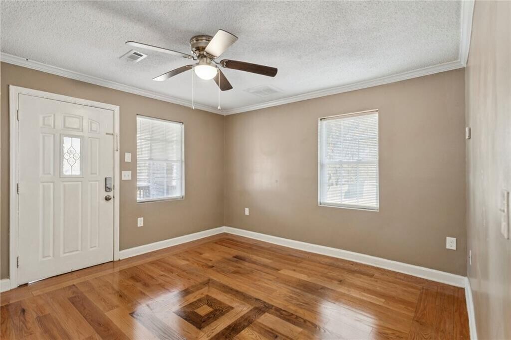 Incredible opportunity to lease Unit A of a charming triplex located in the lovely Grove Park neighborhood. This unit is move-in ready and ideal for anyone seeking close proximity to Midtown and Downtown attractions,including Mercedes-Benz Stadium,State Farm Arena,and a variety of trendy restaurants and food halls. Enjoy easy access to top educational institutions such as Georgia Tech,Georgia State,Spelman College,and Morehouse College. Commuting is a breeze with convenient access to major highways,nearby MARTA public transportation,and just 5 minutes to Woodson Park Academy Elementary. Abundance of off street parking to the left of driveway. Lease includes water usage. Walk up a few steps to an adorable front porch leading into the left-side entrance of the home. Inside,you’ll find a spacious living room,followed by a large kitchen with a side entry door. Down the hallway sits a generous bathroom and two bedrooms—one bedroom is perfect for an office or nursery—plus an additional oversized primary bedroom.