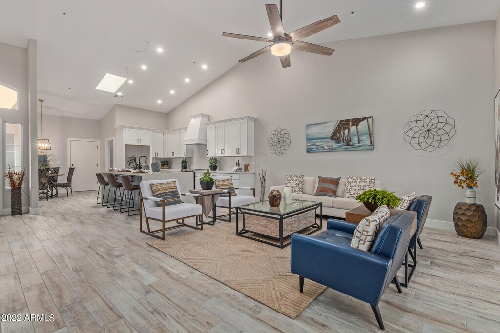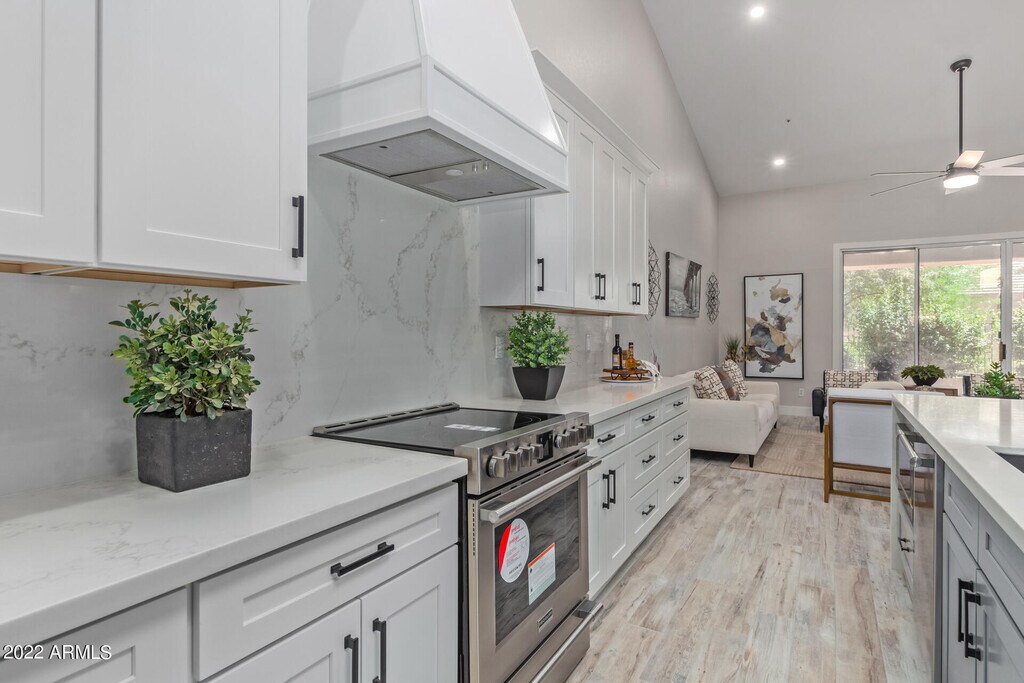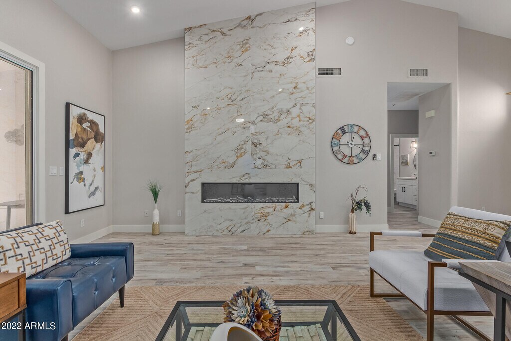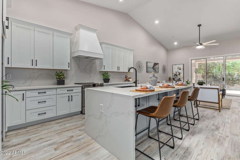 Remodeled in the heart of North Scottsdale's Ironwood Village community. This elegant modern floor plan was designed with the most refined of connoisseurs in mind. You'll love the beautifully appointed kitchen that offers high-end design coupled with seamless functionality. Vaulted ceilings provide an abundance of natural light with ample interior space,ideal for entertaining family,friends and neighborhood guests. High-end finishes include porcelain wide-plank flooring,Modern Flames linear fireplace framed by oversized porcelain tiles,white shaker cabinetry,custom designed range hood,Quartz countertops with waterfall island,full quartz backsplash,modern pendant lighting and new stainless appliance package.