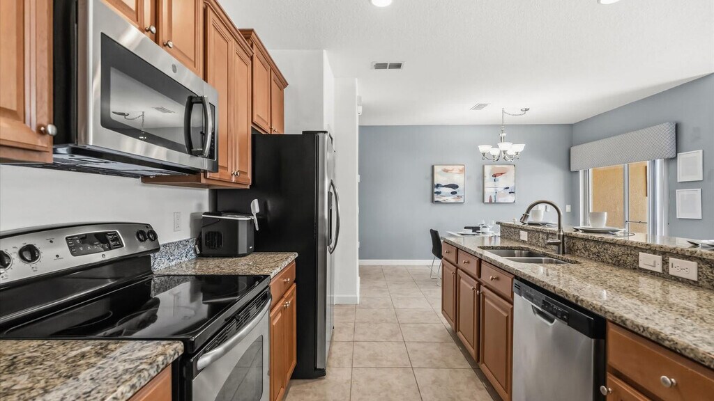 Feel at home in this Kissimmee getaway! This 4-bedroom, 3-bath townhome at Paradise Palms Resort is perfect for families and groups seeking fun and relaxation near Disney. This stylish home offers a private pool and hot tub, an open-concept living area with a Smart TV and Xbox, and a fully equipped kitchen with stainless steel appliances. There is indoor dining for 8 and breakfast bar seating for 4. An in-unit washer and dryer, central AC and heating, and high-speed Wi-Fi are also available. Pool heating is available for $35 per night with a 2-night minimum. A barbecue propane tank can be delivered for $55. A Pack 'N Play crib and a highchair are available for rent for $40 each. Located just minutes from shopping, dining, and Orlando’s top attractions, this home offers the perfect balance of adventure and relaxation. Theme parks and attractions nearby include Magic Kingdom Park, EPCOT, Disney’s Hollywood Studios, Disney’s Animal Kingdom, SeaWorld Orlando, and Universal Studios Florida. The Florida Mall is also nearby. Quiet hours are between 10 PM and 8 AM. Parties, events, and smoking/vaping of any kind are prohibited in or around the property and risk a fine of $150. Late departures will result in a fine of $150 for each additional hour the property cannot be accessed for turnover. Outside of service animals, pets are not permitted at this property, and any evidence of pets will result in a fine. Firearms and weapons are strictly prohibited. [SI]
