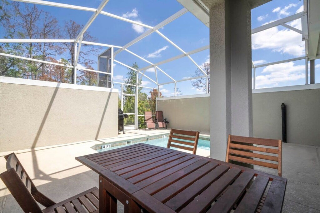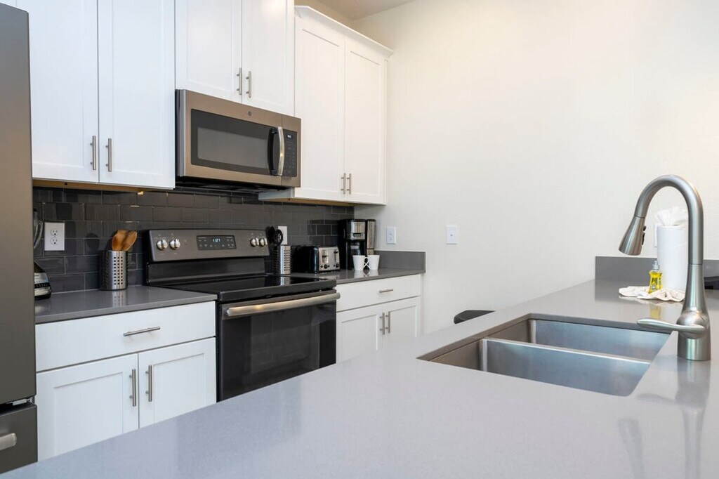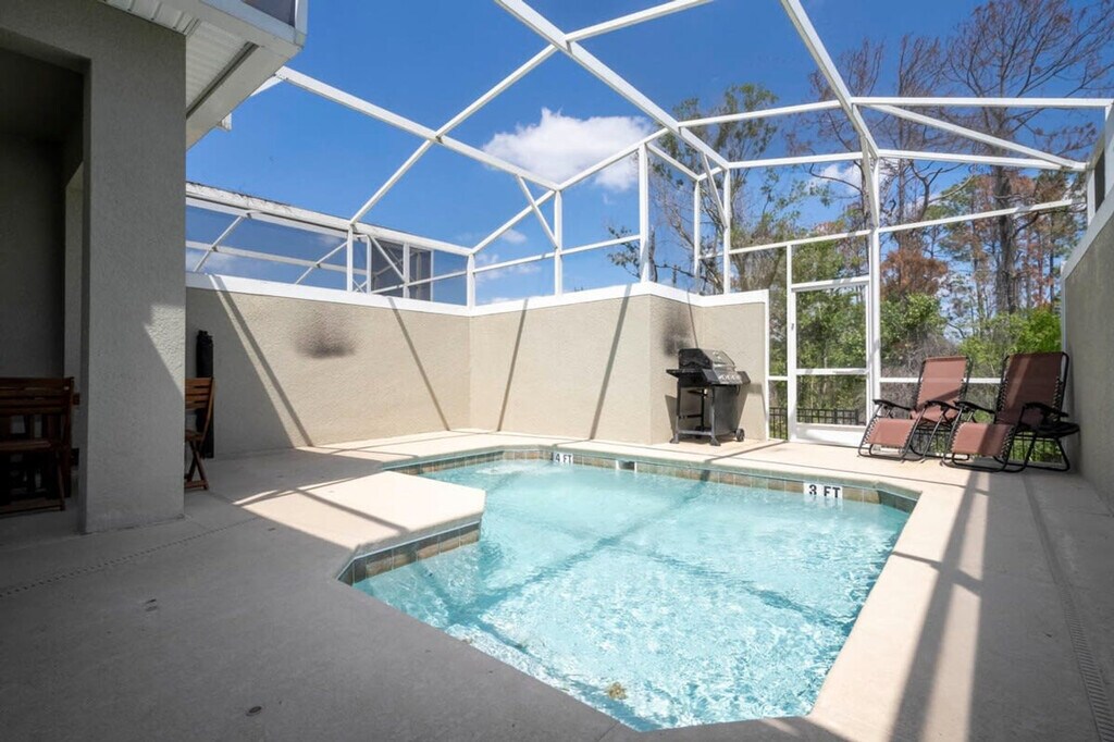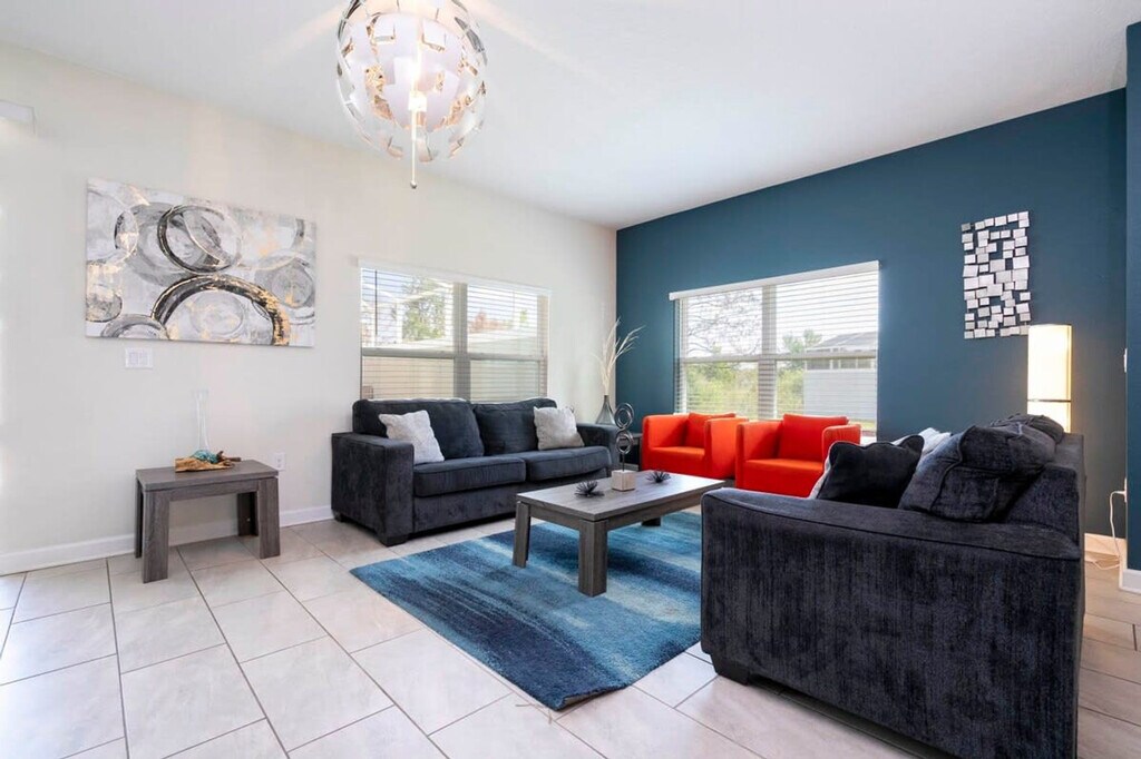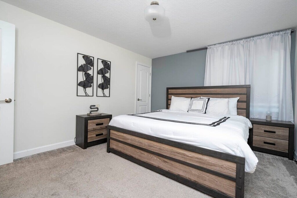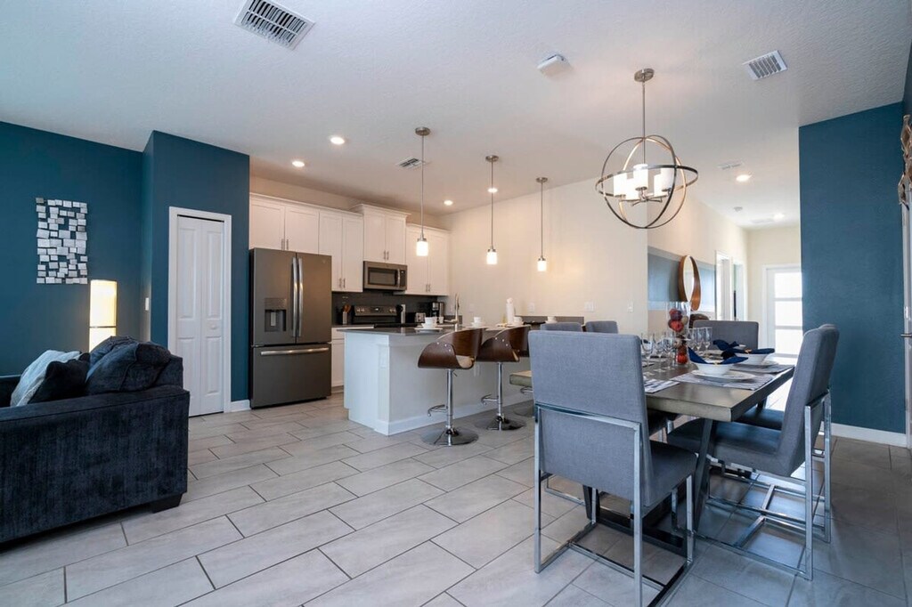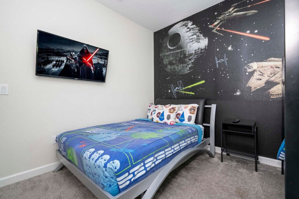 Explore the charm of this inviting 5-bedroom, 4-bathroom townhome, designed to accommodate up to 14 guests. Feel at home with the enchanting Star Wars-themed bedrooms and your private pool oasis for relaxation and enjoyment. Situated in the esteemed Champions Gate resort, this Orlando/Kissimmee retreat offers a full clubhouse with two pools, a lazy river, tennis courts, and a fitness center. Convenience is ensured with nearby markets, restaurants, and stores, making it your ideal vacation home. Immerse yourself in the charm of this carefully crafted 5-bedroom, 4-bathroom townhome, spaciously and delightfully comfortable. The living room seamlessly merges with the dining area and fully equipped kitchen, creating a central space for relaxation and culinary pleasures. Step outside to the outdoor haven where your private, heatable pool on the patio beckons you to unwind. The first floor features a king bedroom and a Star Wars-themed bedroom with one full bed and a bunk bed with two single beds, both sharing a bathroom. Upstairs, you'll find the master king bed suite, another king bedroom with an en-suite bathroom, and the fifth bedroom with a bunk bed featuring one full bed and two twin beds, along with its own bathroom. For added convenience, a laundry room with a washer and dryer awaits. Enjoy complimentary Wi-Fi and free parking, and start your stay with a welcome kit containing essential bathroom and kitchen amenities. Heating the pool is a paid service and there is also a fee charged to use the barbecue grill. Champions Gate Resort is a resort-style community offering every imaginable amenity for a blissful stay. It features an impressive clubhouse with a variety of courts and outdoor activities like tennis, beach volleyball, and a golf course. The restaurant and fitness center will help you stay refreshed and fit. Its swimming pool complex is perfect for a splashy day, with slides, a lazy river, and a kids splash pool. Plus, the resort is just 20 minutes away from Disney Parks, ensuring plenty of opportunities for fun and adventure. Shopping, dining, and entertainment are also within reach, with stores, restaurants, and supermarkets nearby. It's the perfect place for a family getaway. Quiet hours are between 22:00 and 8:00. Replenishment of bathroom and kitchen amenities is the guest's responsibility. [SI]