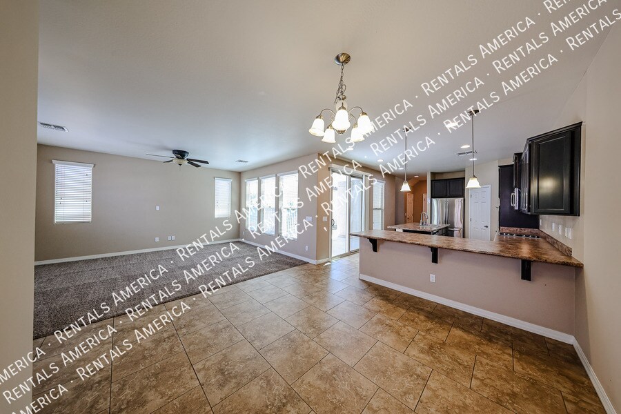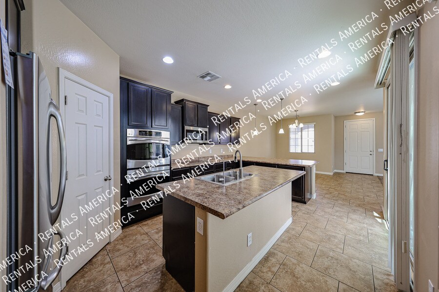 $1,000.00 OFF 1st full month's Rent if Move In by November 20th. Charming Home just minutes from State Farm Stadium & Westgate Entertainment District. A short walk to a landscaped park w/ garden fountain, swimming pool and playground. Open layout w/ family room and kitchen designed to overlook an inviting pergola covered patio surrounded by native plants & synthetic grass. Kitchen features a large island w/ bar seating & built-in sink, counter breakfast bar w/ pendant lighting, rich hardwood cabinets, double wall ovens, built-in microwave, stainless steel appliances and walk-in pantry. Upstairs has a functional split plan w/ center loft and laundry room w/ washer & dryer included. Primary Ste includes a large bedroom, walk-in shower, garden tub, double sink vanity, private toilet room and walk-in closet with open shelving. One Time Admin Fee: $300, Pet Deposit: $300/pet (if applicable), Service Fee: 2%, $39/month Resident Benefits Package, Helping Heroes Discount Available! Carpet Ceramic Tile Disposal Dogs Allowed Dryer Garage Pets Allowed Washer