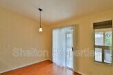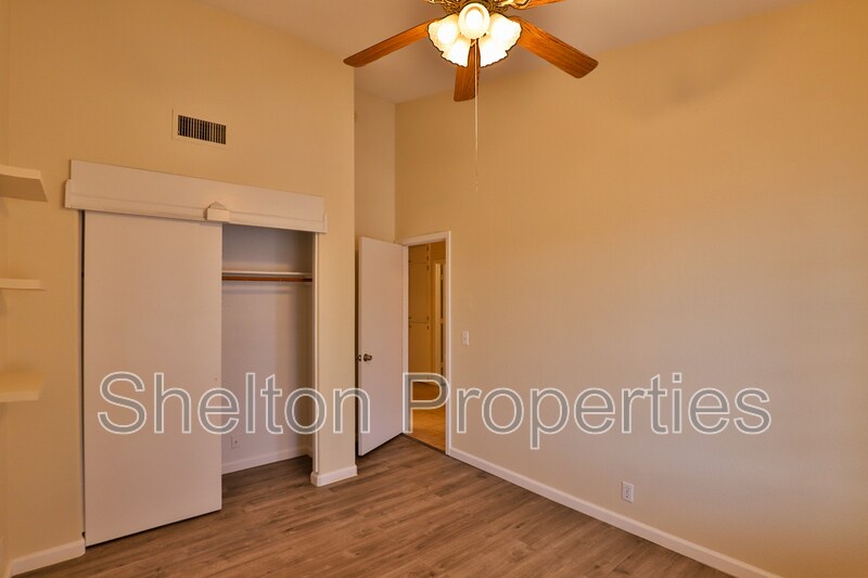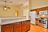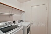 This single-level three-bedroom, two-bathroom home in Glendale features a two-car garage and a well-designed layout. The interior includes wood-like and tile flooring, two-tone paint, and vaulted ceilings that enhance the sense of space. A fireplace provides a comfortable focal point in the living area, which also features window coverings. The kitchen is equipped with a center island, an elevated breakfast bar, and appliances including a refrigerator, oven, dishwasher, and microwave. A washer and dryer are also included for convenience. The primary bedroom serves as a private retreat with an attached bathroom featuring a dual-sink vanity, a separate shower and tub, and a walk-in closet. Outside, the property offers a private fenced-in backyard with a spacious covered patio and a storage shed for additional storage needs. This home provides a functional living environment with a balance of indoor features and outdoor utility.