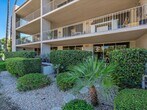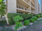 .Spacious corner unit with tile flooring throughout,featuring versatile open living and dining areas. The large terrace is ideal for entertaining or relaxing and offers privacy and views of beautifully lit trees at night. 9-foot floor-to-ceiling windows fill every room with natural light; the screened patio with sliding glass door provides easy outdoor access. Living room includes Spanish style tiled fireplace. The kitchen includes beautiful hand-painted Spanish tile backsplash,ceramic tile counters,and a breakfast bar. Both spacious bedrooms have ample closet space and direct access onto the terrace. HOA dues include cable TV with HBO/Showtime,Internet Wi-Fi service,air-conditioning,water,gas,trash,much more. This spacious condo promises a blend of privacy and comfort,making it the perfect retreat for those seeking a serene yet vibrant lifestyle Desert Island is a unique hi-rise condominium community nestled on a 25-acre island surrounded by a sparkling lake and 18-hole championship golf course. Centrally located to The River shopping,movies & restaurants.