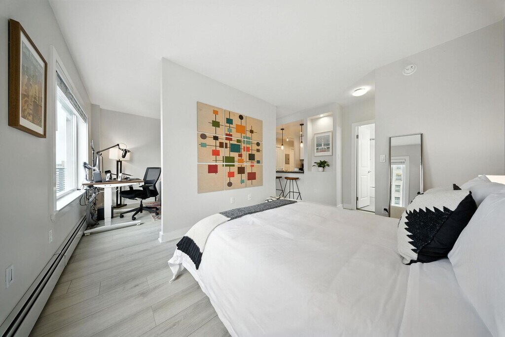 Enjoy upscale living with sweeping views in the historic San Francisco neighborhood of Nob Hill. Feel at home in this fully furnished studio apartment at The Pinnacle. This apartment offers open-plan, stylish interiors with a contemporary design, featuring hardwood flooring, stainless steel appliances, and plenty of closet space. The unit includes a fully equipped kitchen, a full bathroom, a walk-in closet, a smart TV, and in-unit laundry. Amenities include a stocked kitchen with a breakfast bar, a dishwasher, carpeted bedrooms, a resident lounge, a fitness center, a sauna, and a rooftop lounge with outdoor seating. Paid parking is available upon request based on availability, and EV vehicle rental and charging are also available. Take in the breathtaking, panoramic views from the sunny rooftop lounge, get in a workout at the state-of-the-art fitness center, or unwind in the resident lounge using the high-speed Wi-Fi. This unit does not have air conditioning and can reach high temperatures on a sunny day; standing fans are provided in the unit. Internet speeds are not guaranteed and may fluctuate based on your computer model and the router location. Your booking confirmation is contingent upon completing the required verification steps within 24 hours of booking. These steps include creating an account with our trusted partner, completing identity verification, and undergoing a credit and background check. Proof of income may also be required, such as a recent pay stub, a bank statement dated within the last 3 months, or a letter of employment in a PDF format. Failure to complete these steps within 24 hours, or not meeting the minimum eligibility requirements, may result in the cancellation of your reservation. This studio apartment is custom tailored for the remote worker looking for a comfortable and inspiring environment in which to be productive. Along with stunning views of the city and surrounding hills, the unit features a full home office set-up with private high-speed internet. Includes a standing desk (Uplift), an ergonomic work chair (Uplift), a 34-inch ultra-wide monitor (Samsung), a microphone (Blue Yeti), a webcam (Logitech), computer speakers (Bose), an LED streaming light, a green screen, a keyboard (Logitech), a mouse (Logitech), and a TOTU 16-in-1 Triple Display USB-C 3.1 Docking Station. A laptop computer is not included. [SI]