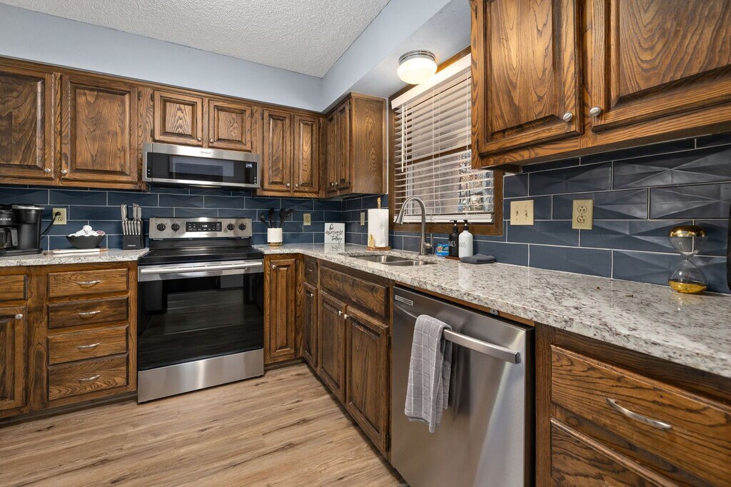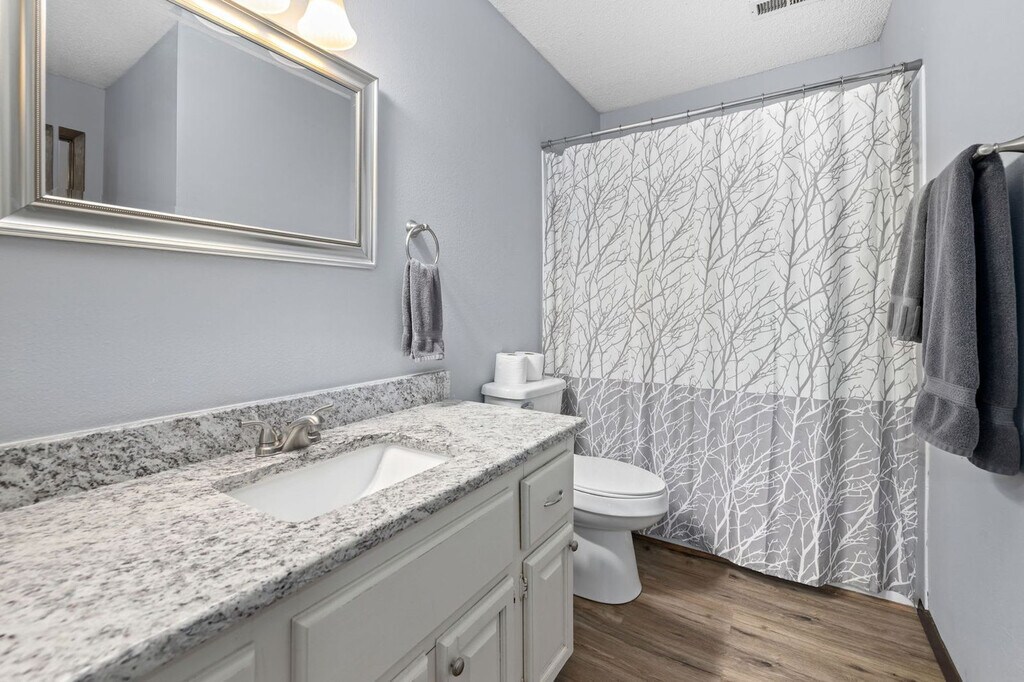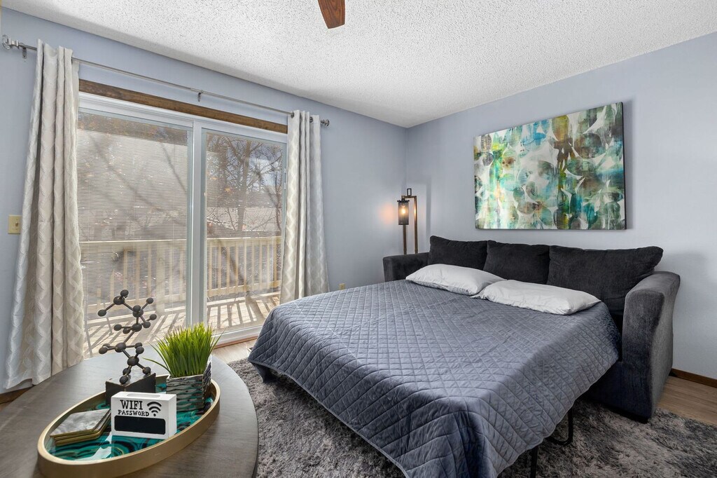 Welcome to Tunnel Vista, the premier spot for anyone looking to experience Northwest Arkansas' natural beauty and bike trails. Feel at home in this 2-bedroom, 1.5-bathroom home that accommodates up to 6 guests. This home features a fully stocked kitchen with all the necessary amenities and appliances, a cozy living room with a large Smart TV, a dining table for 6, a washer and dryer for guest use, and a balcony with a table and grill. The open-concept living room, kitchen, and dining room create the perfect space for memorable gatherings. This property is pet-friendly with a fee of $90 per dog, with a maximum of 3 dogs. A pack 'n Play is available for guest use. Located along the Tunnel Vision Trail, this apartment connects to the famous Little Sugar Mountain Bike Trail and The Razorback Greenway. It's also just 1 block to the Bella Vista Recreation Center, 1/2 mile to Kingsdale Golf Course, 3 miles from Tanyard Creek Nature Trail, 1 mile to Lake Windsor, and 7 miles to Downtown Bentonville. Walk, drive, or ride your bike around town. Parties or guest actions that result in disturbances, property damage, extensive extra cleaning, or smoking indoors will incur a fine of $1,000. Dogs discovered at the property without prior notice or cats discovered at the property will incur a fine of $400. Unauthorized checkout delays will incur a fine of $100 per hour. If you smoke in the home, you will be fined $1,000 plus the cost of any smoke remediation necessary. [SI]