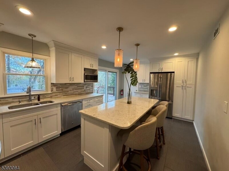 A bright and airy colonial home, perfectly positioned for a quiet and peaceful lifestyle in the highly desirable Parsippany community. This well-maintained property boasts 4 bedrooms and 2.5 bathrooms, with a new roof (2018) and new windows (2020). The inviting entry leads to a sunlit, high-ceiling living room with a wood-burning fireplace. Hardwood floors flow through the living and dining areas. The chef's kitchen, renovated in 2023, features quartz countertops, a large center island, stainless steel appliances, and abundant cabinetry, along with three chairs for casual dining. The second floor hosts a large master suite with a renovated bath and a customized walk-in closet, plus three additional well-proportioned bedrooms and a full bathroom. The partially finished basement offers versatile space for your needs, while the private backyard with a fantastic deck is perfect for staycationing. Conveniently located near top-rated schools, parks, shops, and major highways for an easy NYC commute. This rental also includes the following furnishings for your use: Kitchen: 3 chairs; Family Room: TV console & 2 coffee tables; Dining Room: Table, chairs, and cabinet; Deck: Furniture & grill.